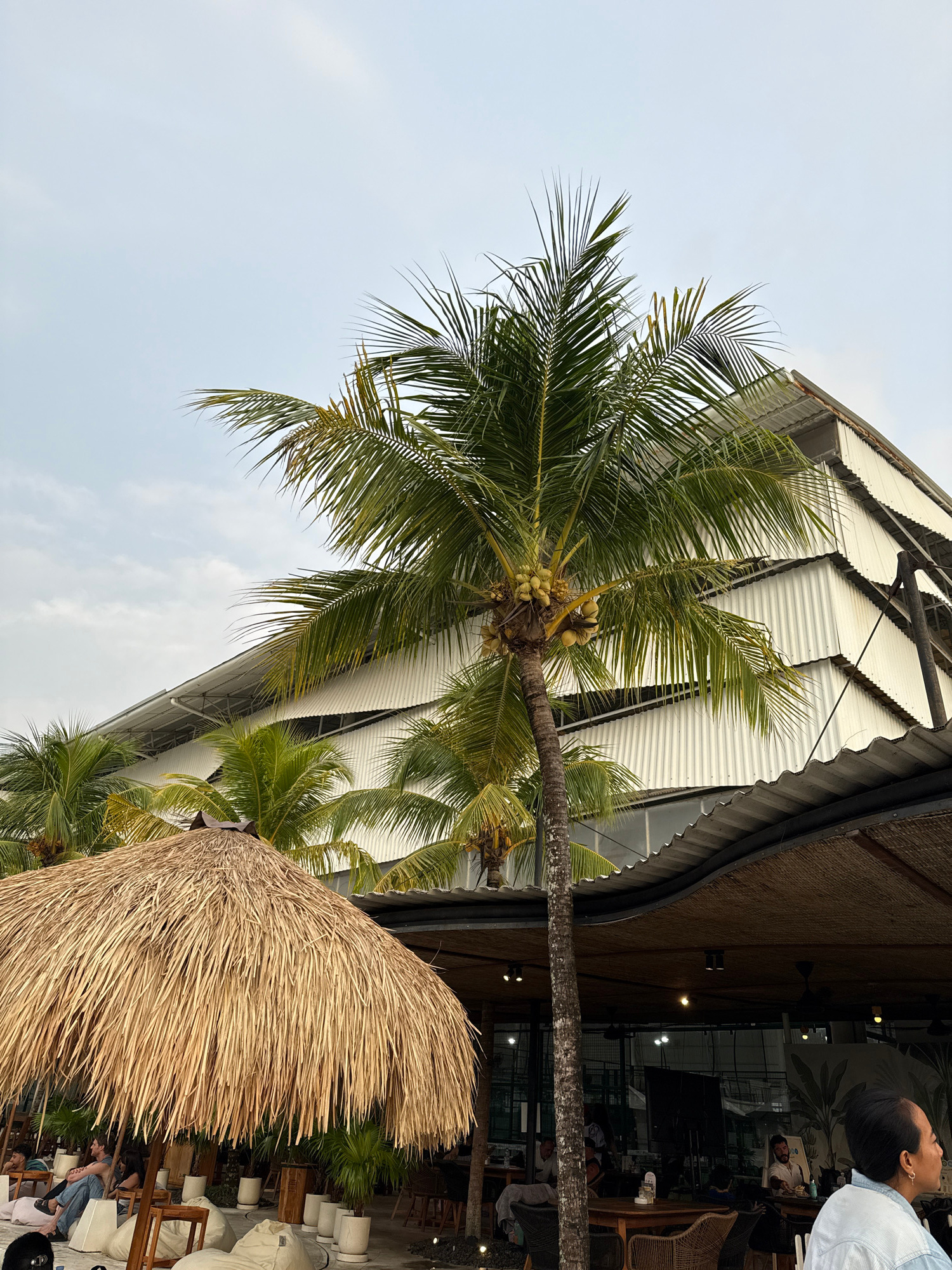 The scene captures a restaurant or cafe setting in Canggu, Indonesia, characterized by a blend of modern and tropical design elements. Patrons are seated at tables, engaged in dining and conversation.…read more