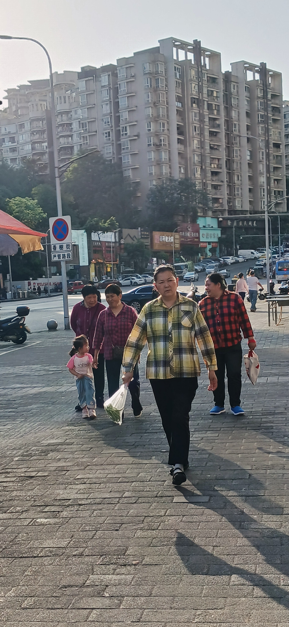 A group of five people, including a child, walks along a brick-paved sidewalk in an urban area. The backdrop consists of tall apartment buildings and a busy street with cars and pedestrians. The group…read more