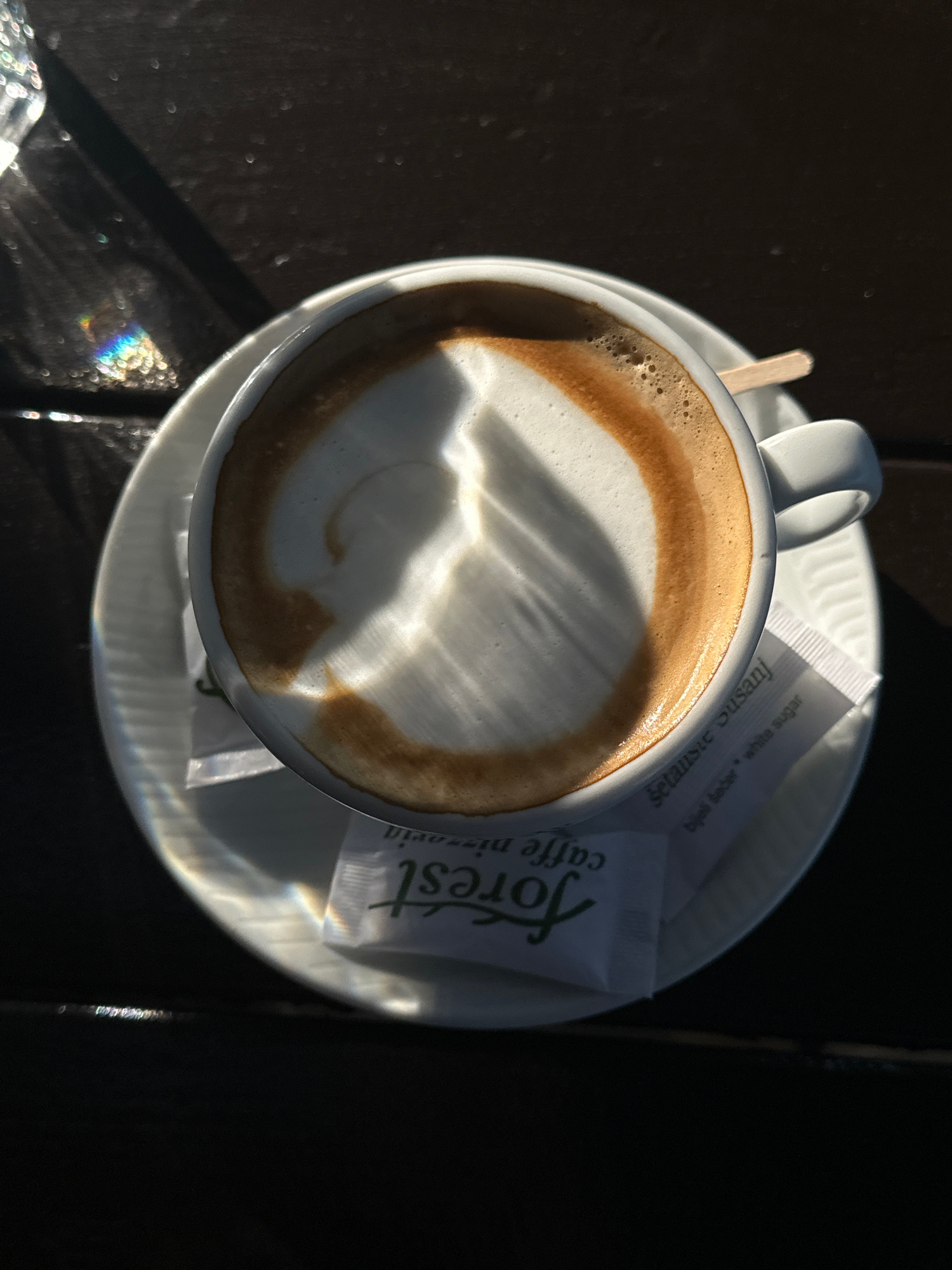 The image shows a top-down view of a cappuccino on a white saucer, placed on a dark surface that appears to be a table. Next to the cup are two packets of sugar. The branding on one sugar packet reads…read more