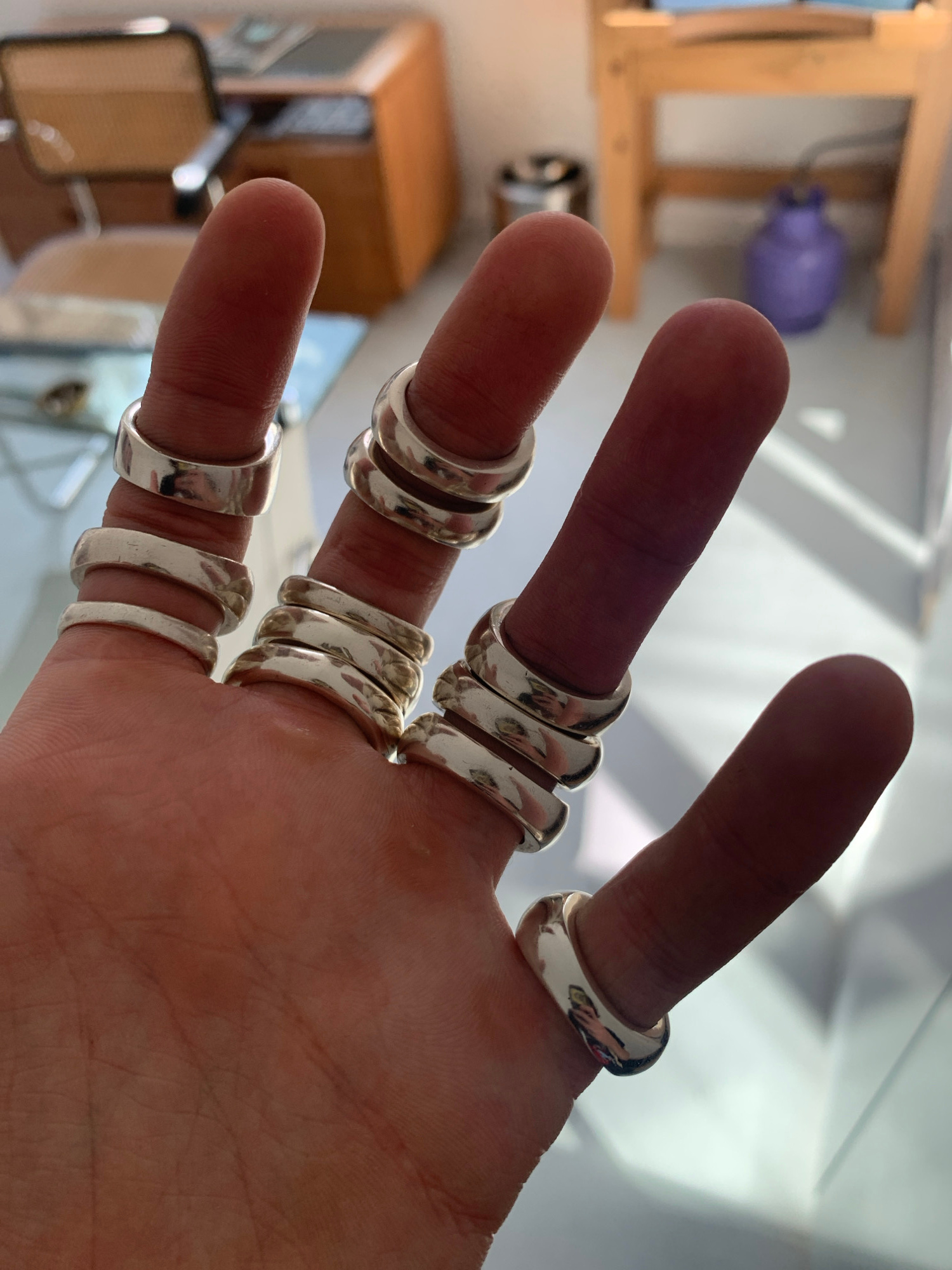 A close-up photograph shows a person's hand with multiple silver rings on each finger. The hand is positioned in the foreground with fingers splayed. Each finger except the thumb has two or three ringβ¦read more