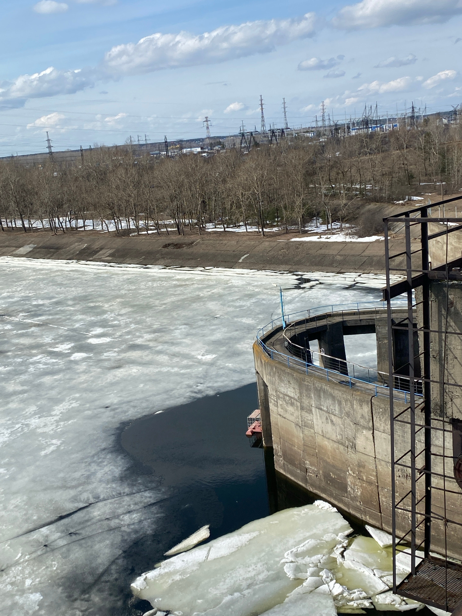 The image shows a section of the Kama River in Chaikovsky, Russia, during a period of ice breakup. A concrete structure, part of a dam or bridge support, protrudes over the partially frozen river. Lar…read more