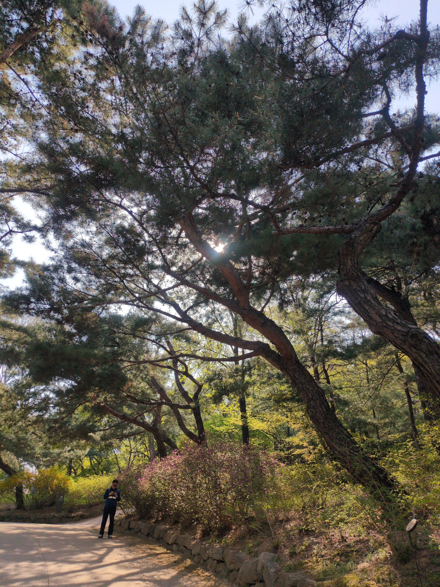 A person stands on a sunlit path in a park-like setting. The path curves gently, bordered by vegetation. A large tree with dense foliage dominates the foreground, its branches spreading across the fra…read more
