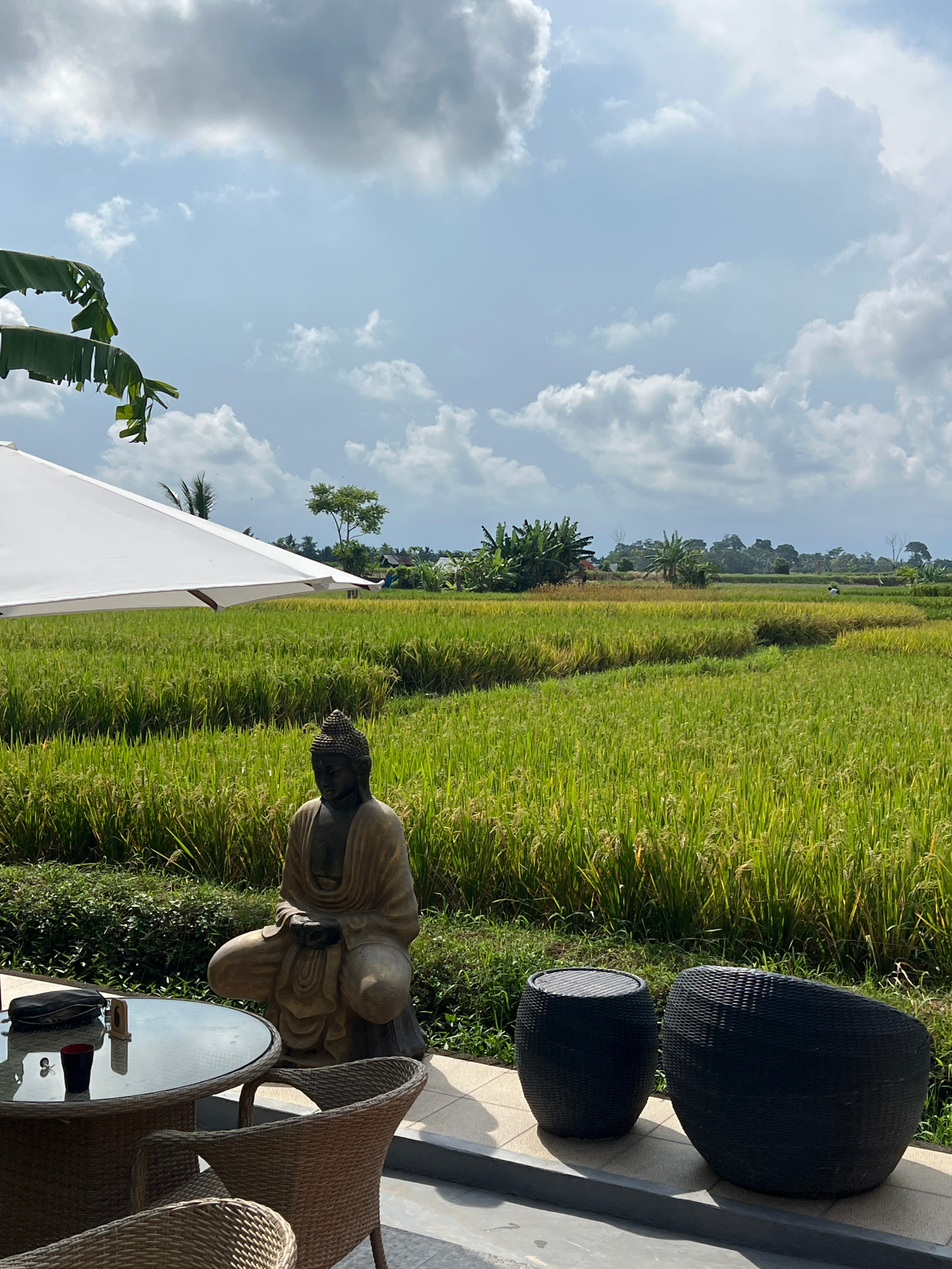 The image depicts an outdoor scene in Singakerta, Indonesia. A lush, green rice field dominates the background. In the foreground, there's a seating area with two black wicker chairs positioned on a lā¦read more