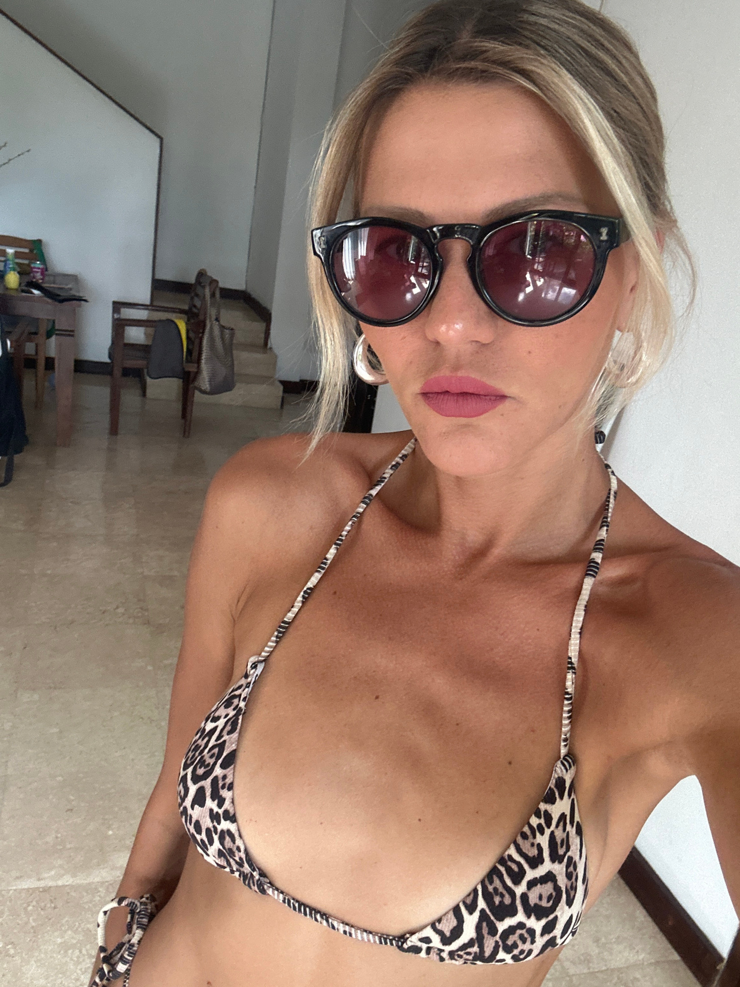 A waist-up portrait captures a woman with blonde and light brown hair, posing indoors. She is wearing oversized dark sunglasses with reflective reddish lenses and has matte pink lipstick. A large, sil…read more