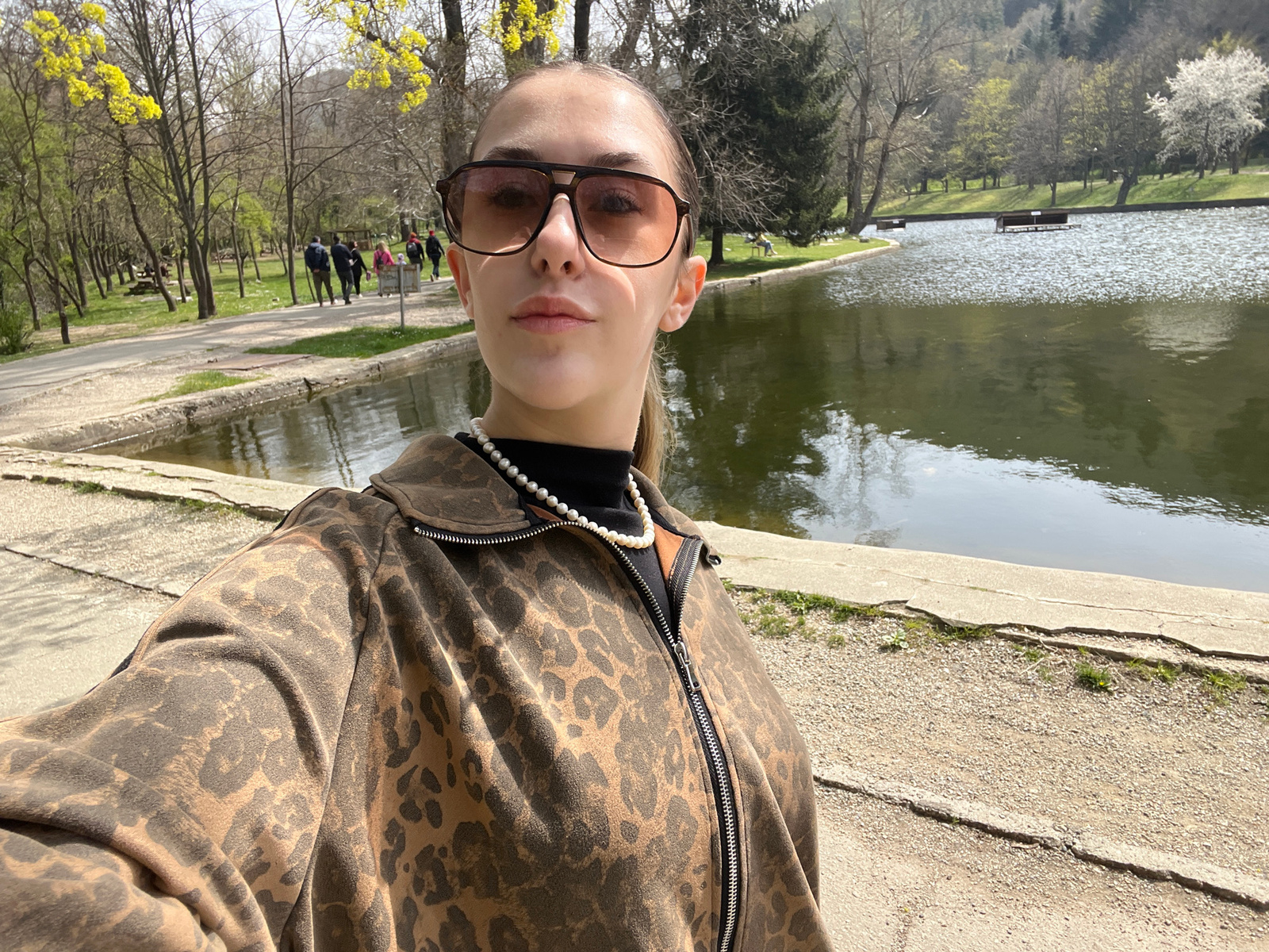A person with glasses is facing the camera, wearing a brown animal print jacket with a silver zipper and a pearl necklace. They are standing beside a body of water, possibly a lake or pond. In the bac…read more