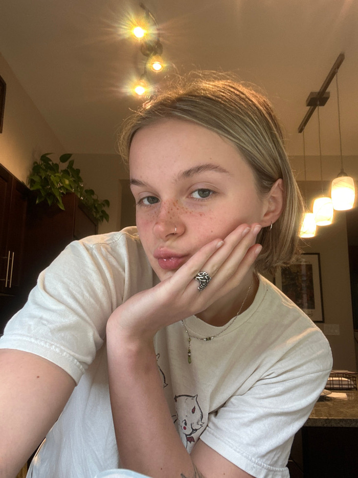 The image displays a female individual situated indoors, presumably within a residence in Whistler, Canada. The subject possesses fair skin, short blonde hair with highlights, prominent freckles acros…read more