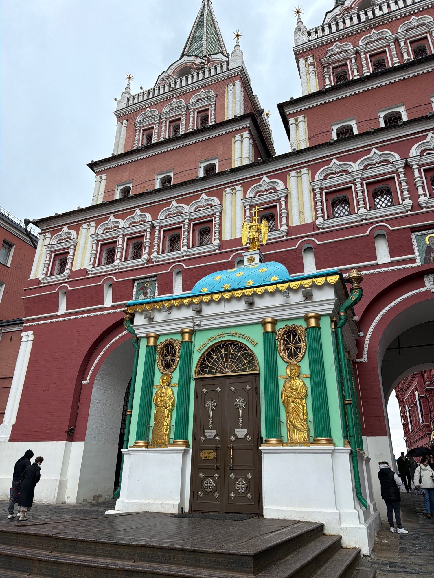 The image is a low-angle shot of an ornately decorated building in Moscow, Russia. The architecture features red brick, white detailing, and multiple tiers with arched windows. A green structure with…read more