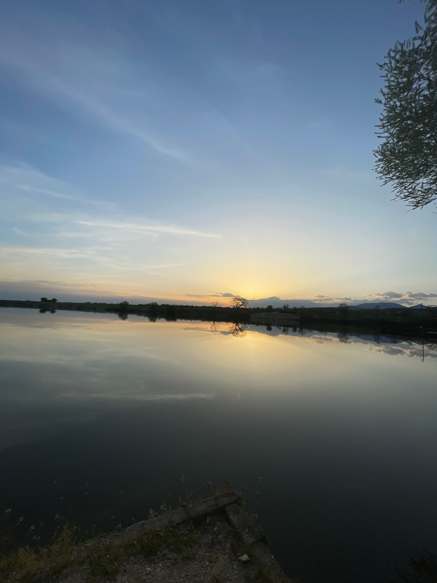 The image shows a vertical view of a landscape that appears to be a lake or large body of water reflecting the sky, land, and sun. A narrow strip of land runs down the center, bisecting the image. Thi…read more