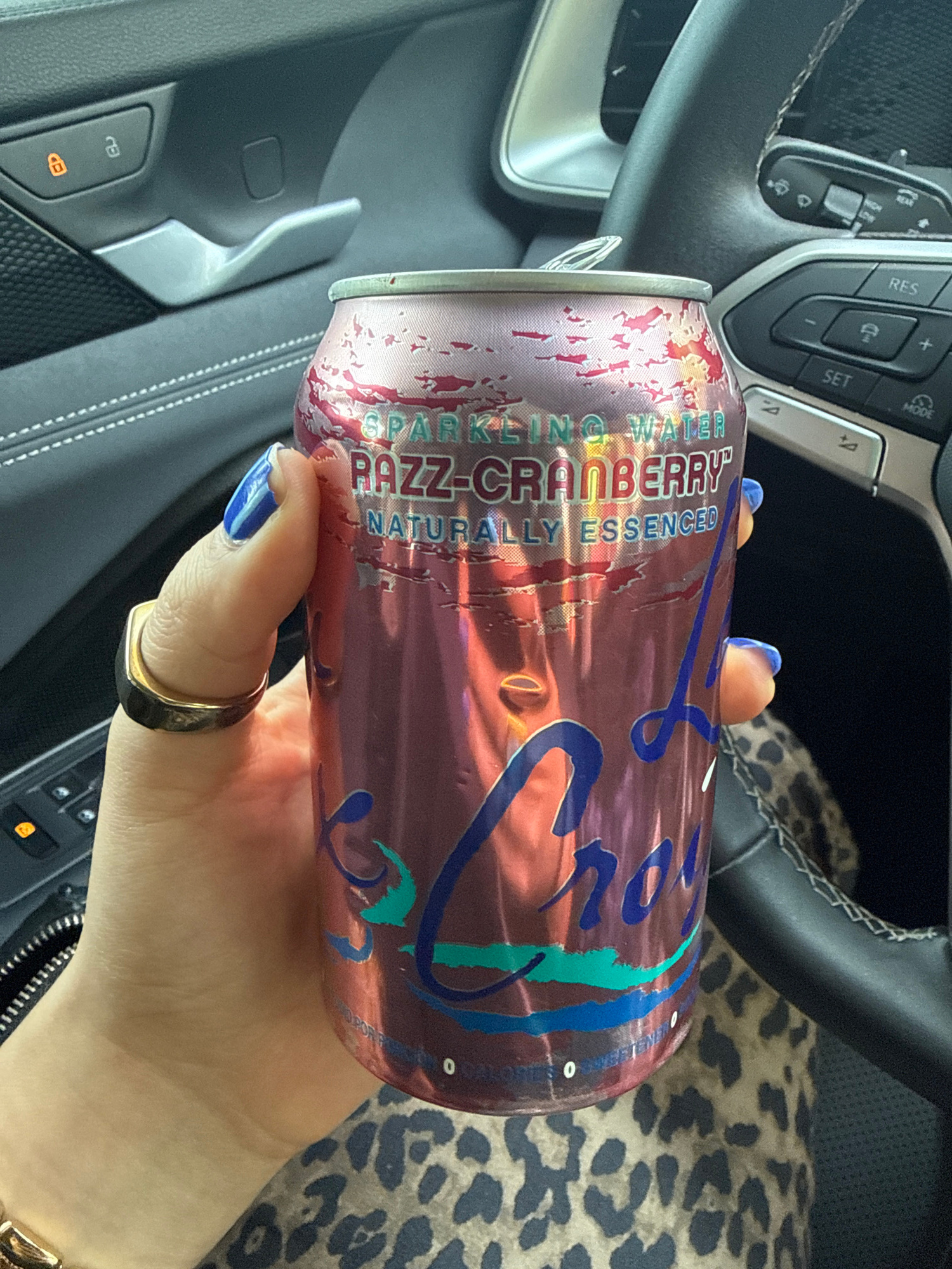 A person is holding a can of La Croix Razz-Cranberry sparkling water in the interior of a car. The can is predominantly pink and features the brand name in blue. The person's hand has blue nail polishβ¦read more