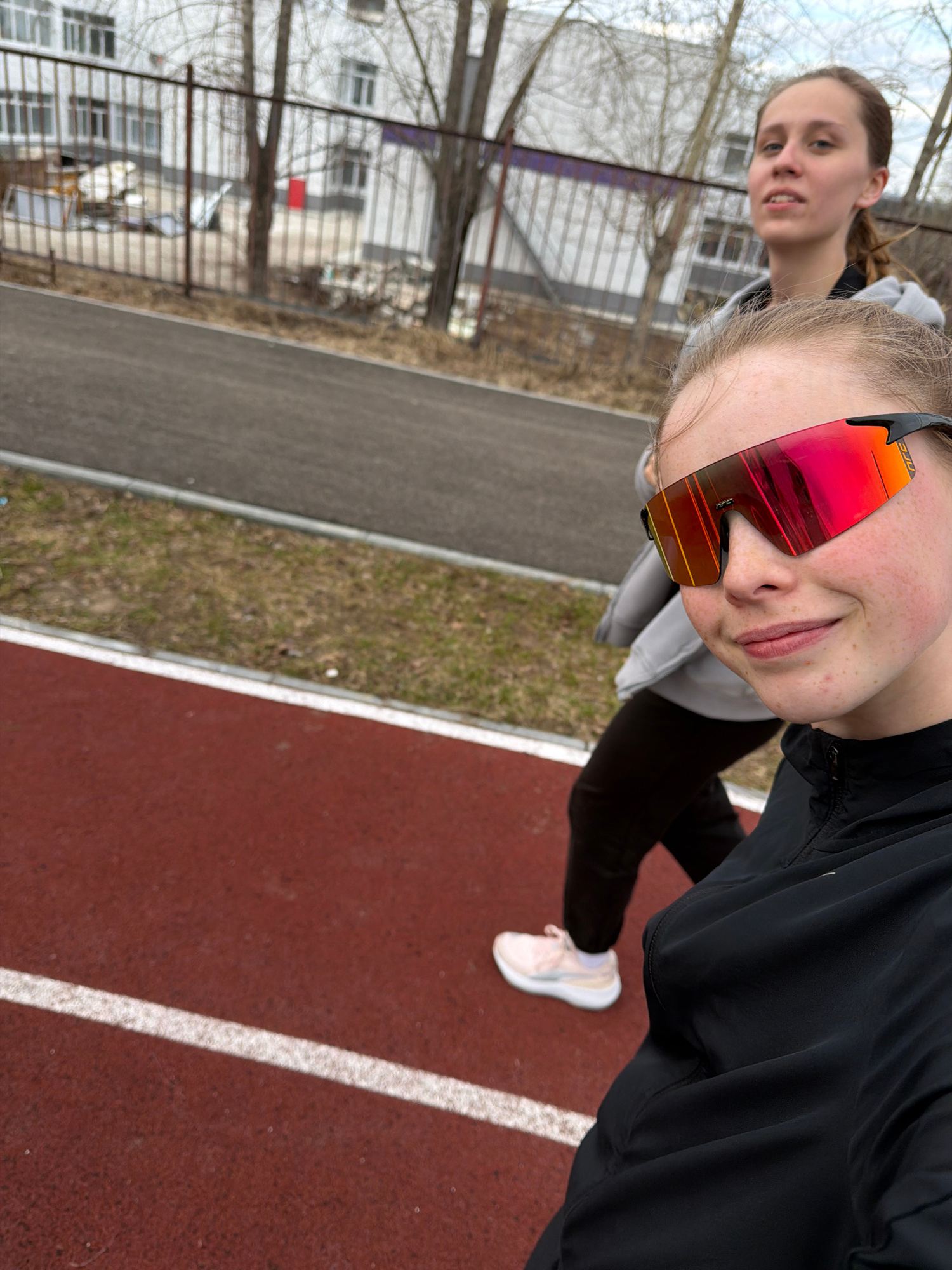 Two young women are captured in an outdoor, angled photo, likely a selfie, taken at what appears to be an athletic track or sports ground in Berezniki, Russia. The woman in the foreground is position…read more