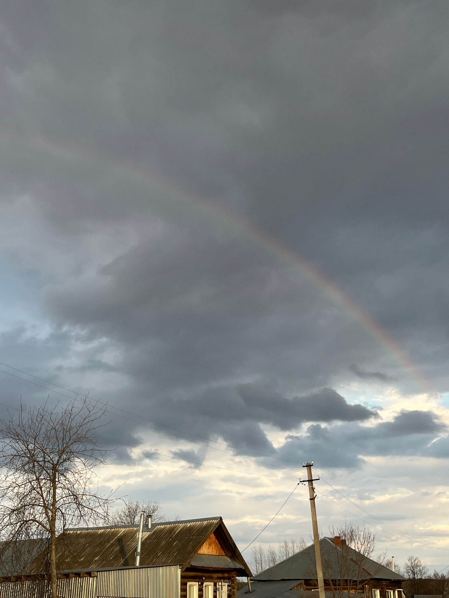The image shows a cloudy sky with a rainbow visible in the upper left portion of the frame. To the right, the roofs and upper stories of buildings are visible, including an electrical pole with wires.…read more