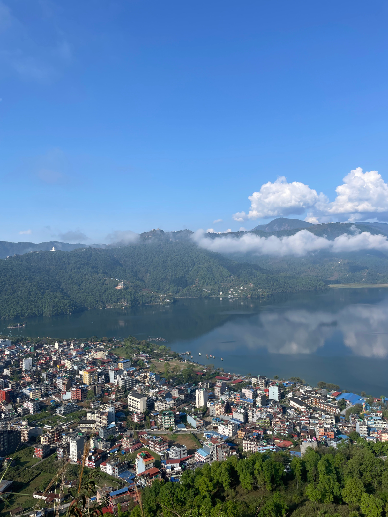 An aerial view of the city of Pokhara, Nepal is shown, with the lake reflecting clouds in the background. Buildings of various sizes and colors line the right side of the water. Mountains, covered in…read more