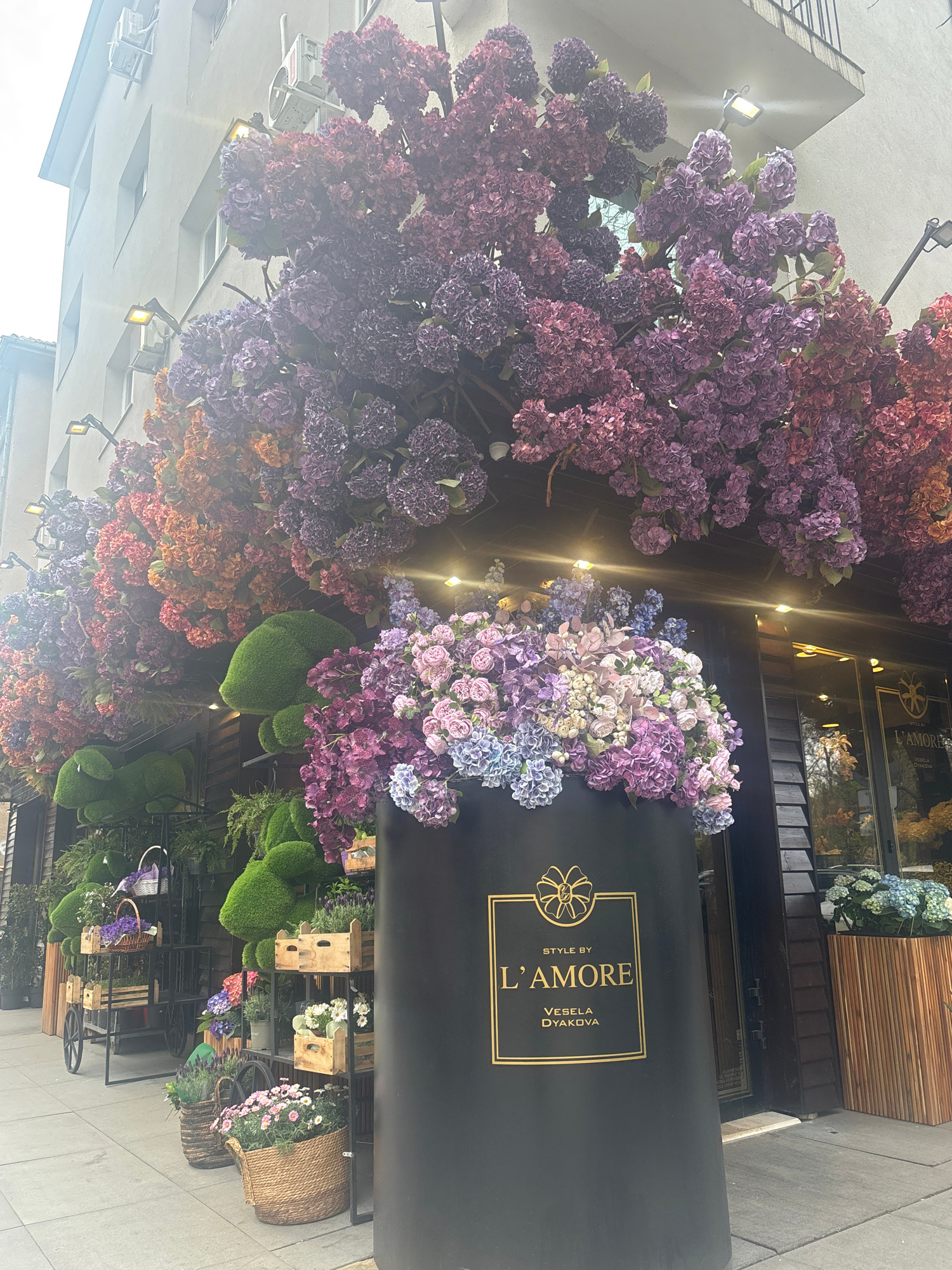 The image captures a lavishly decorated storefront or entrance, rich with artificial flowers and greenery. The scene is dominated by dense clusters of flowers in various shades of purple, lavender, pi…read more