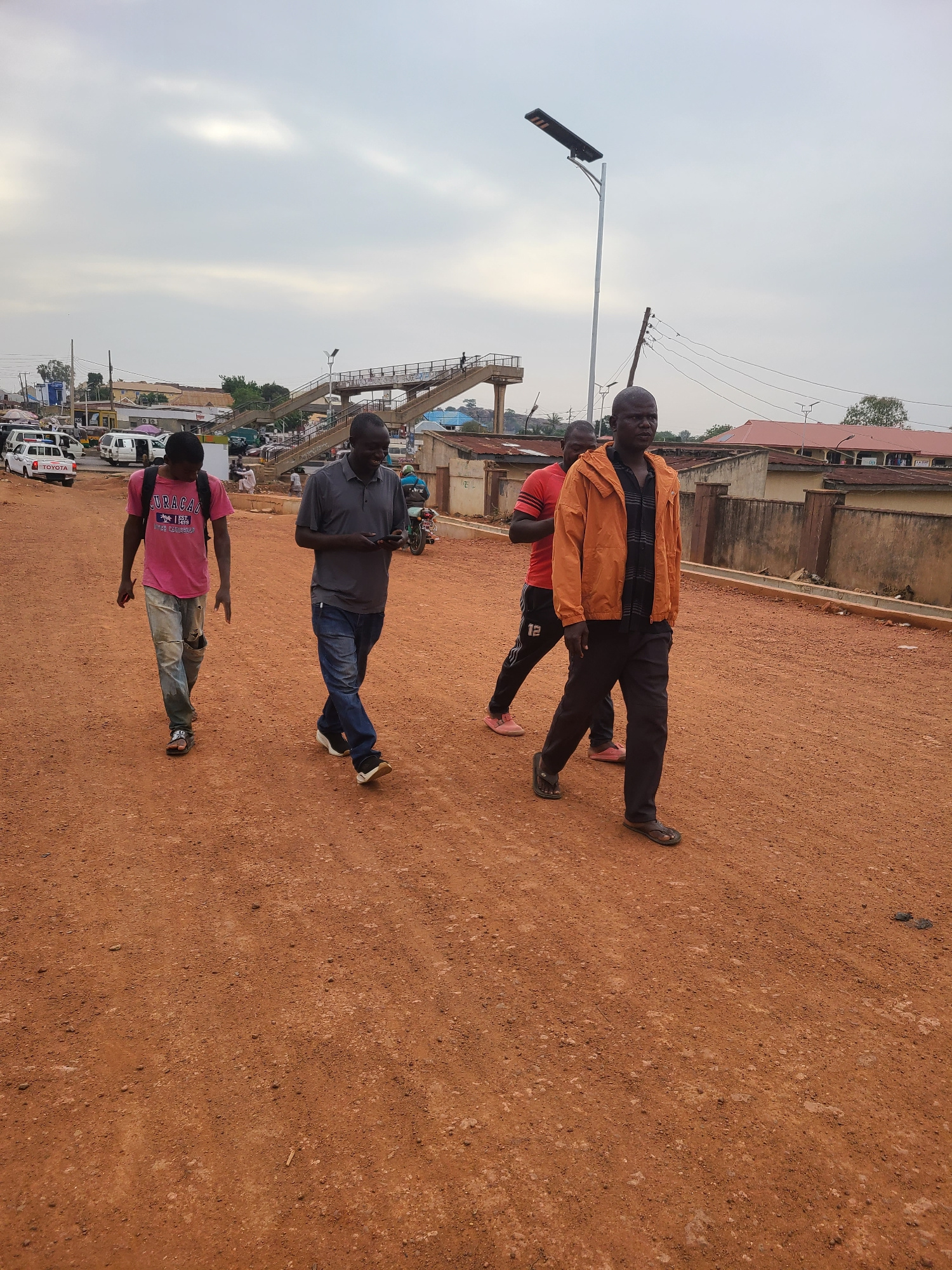 The image displays an outdoor scene in what appears to be an urban or semi-urban environment, characterized by reddish-brown laterite soil, consistent with the provided context of Jos, Nigeria. The sk…read more