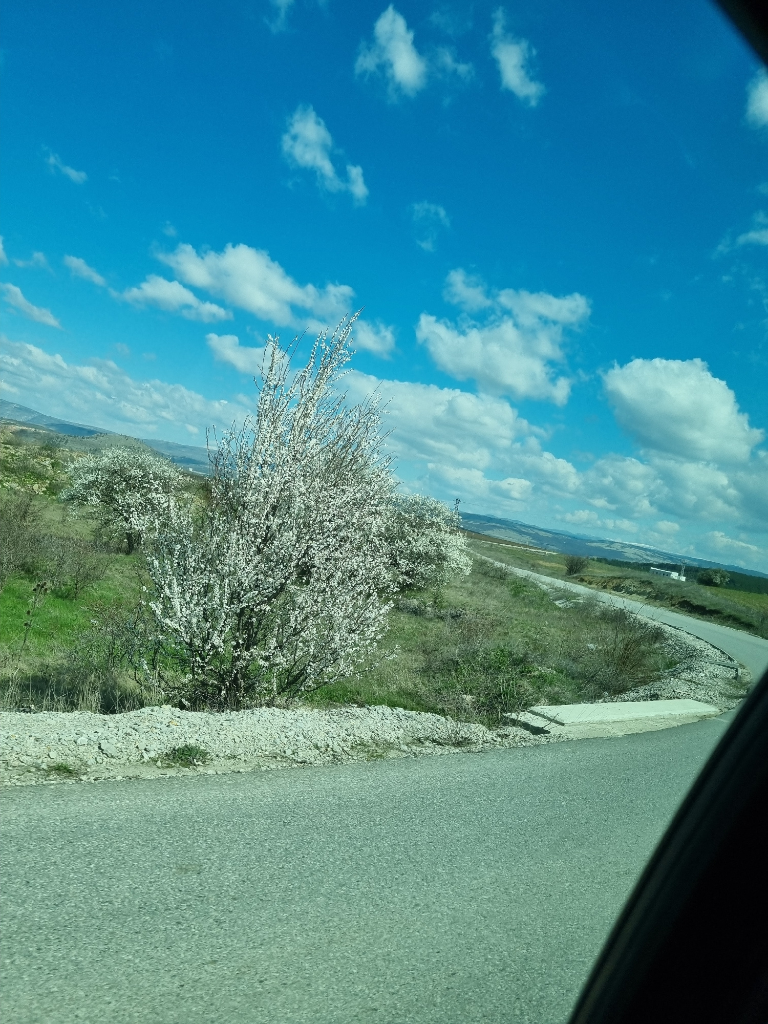 The image depicts a scene from a moving vehicle, likely a car, in what appears to be a rural area near the city of Slivnitsa, Bulgaria. The clear blue sky is dotted with scattered white clouds, suggesβ¦read more