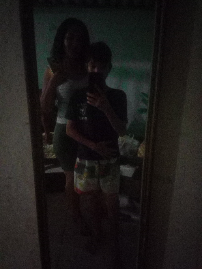 A dimly lit selfie captured in a mirror reflects two figures. A taller woman stands behind a person holding the camera, obscuring their face. The woman wears a light-colored top and a darker skirt. Th…read more