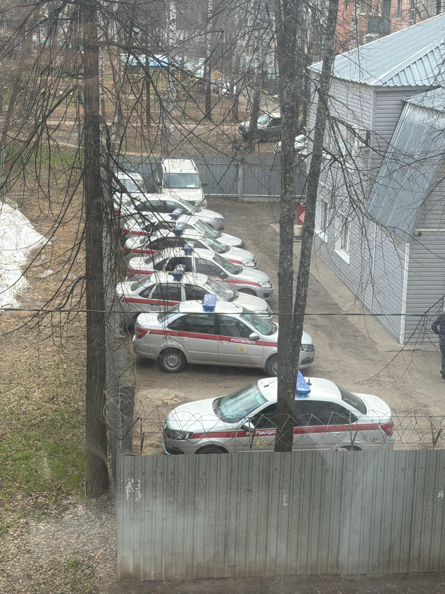An overhead view captures a compound or parking area, likely in Chaikovsky, Russia, during what appears to be early spring. The ground is covered with dry leaves, patches of green grass, and remnants…read more