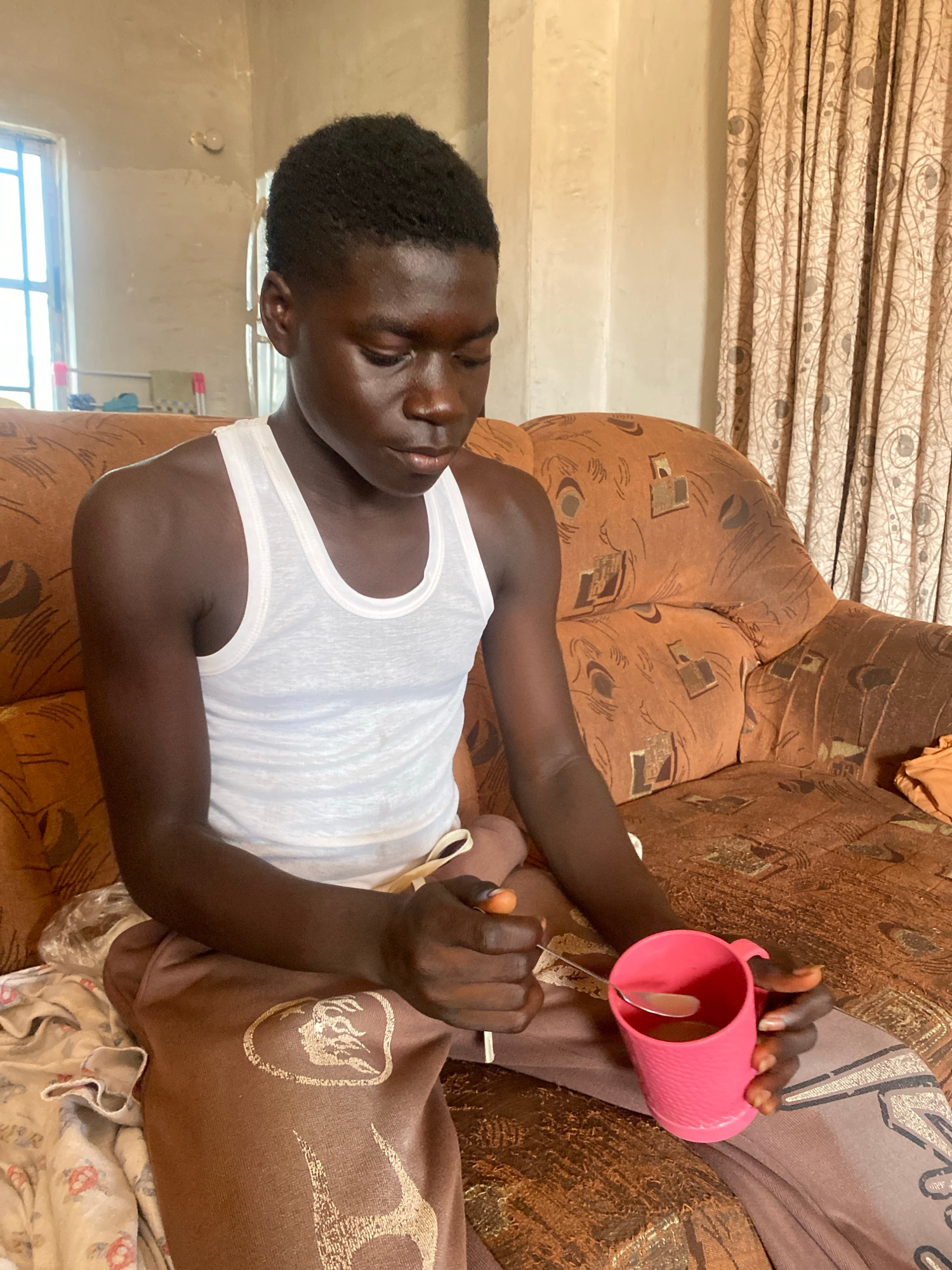 A young Black person is sitting on an upholstered couch, stirring a pink mug with a spoon. The person is wearing a white tank top and brown sweatpants with a logo on the leg. The location is indicated…read more