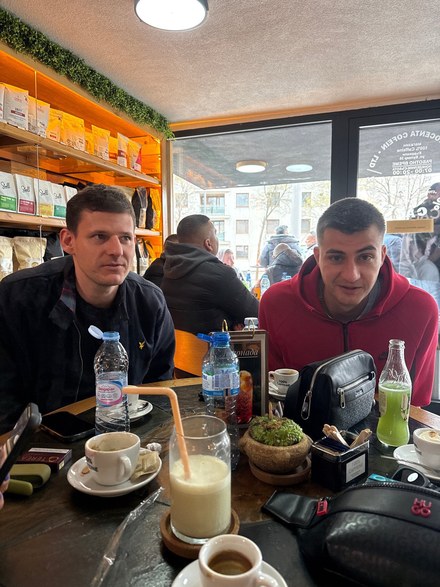 Here is a detailed description of the image: **Scene Overview:** The image appears to be taken from a low-angle perspective inside a cafe or restaurant, possibly in Kardzhali, Bulgaria, judging from…read more