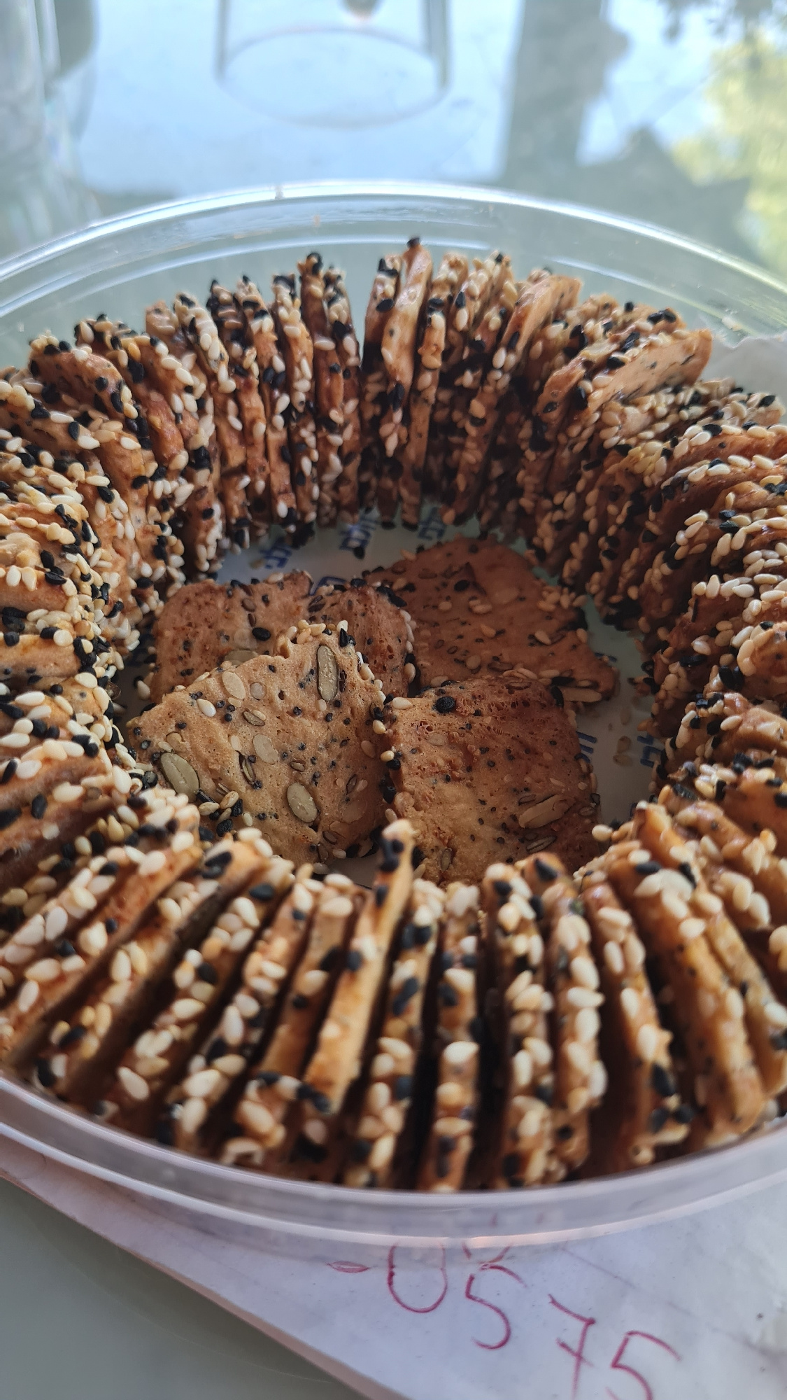The image shows a plastic container filled with sesame crackers, arranged in a circular pattern along the perimeter. The crackers are brown and covered in white and black sesame seeds. In the center o…read more