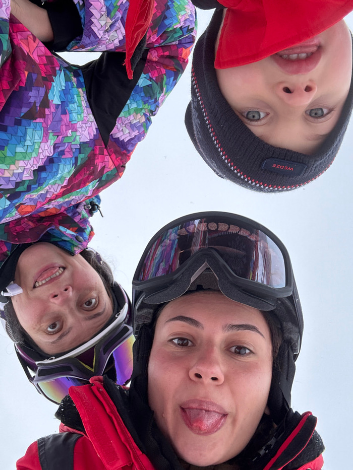 Three individuals are depicted from a low-angle perspective, positioned against an undifferentiated bright white sky, indicative of an outdoor, overcast winter environment in Ayas, Italy. In the lower…read more