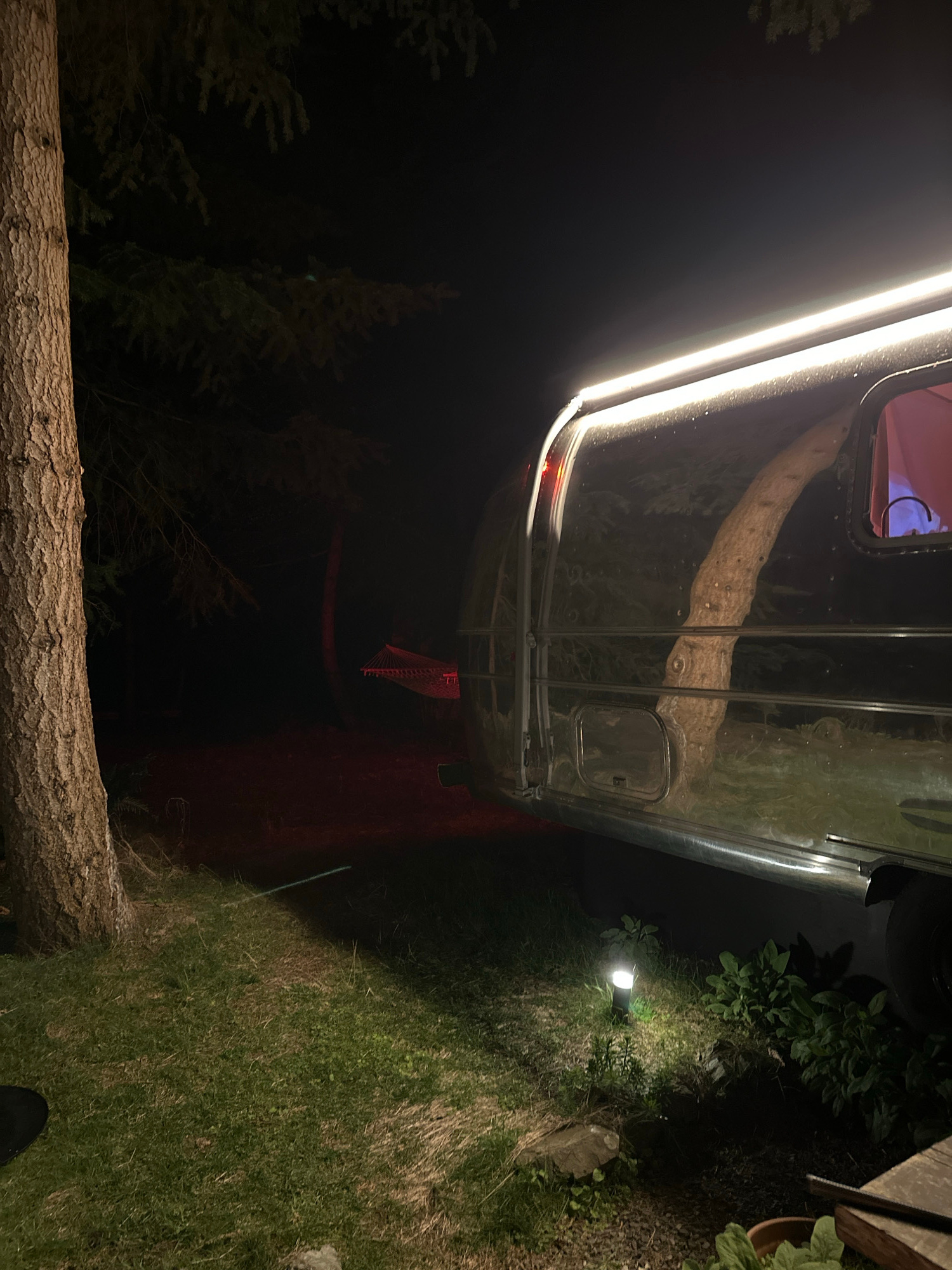 At night in Bowen Island Municipality, Canada, the image shows an Airstream trailer parked on a grassy area next to a tree. The trailer is illuminated by its own lights, and there is a light on the gr…read more