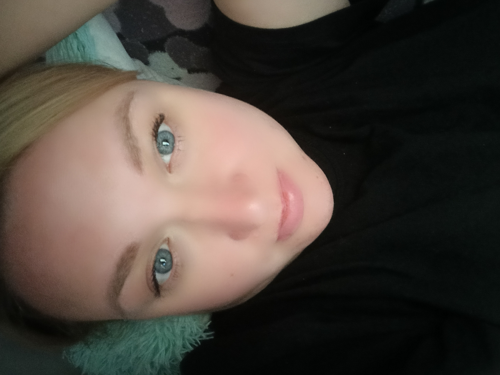The image shows a light-skinned person with blue eyes and blonde hair lying down. The person is wearing a black shirt. A soft, light green and gray patterned surface is behind their head. There is no…read more