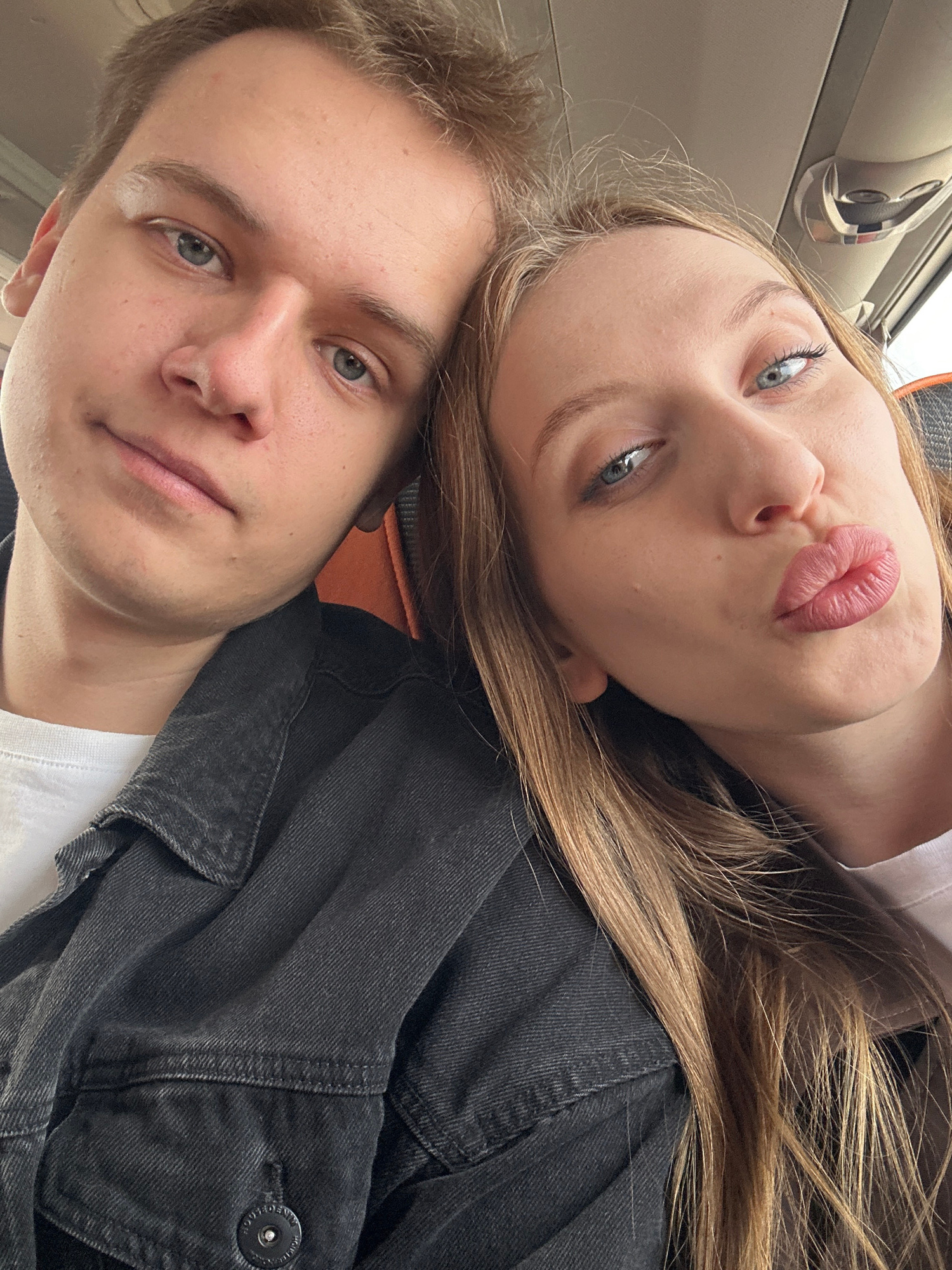 A selfie captures two fair-skinned individuals, a male and a female. The woman is positioned above the man, her head tilted. She has long, light-brown hair and blue eyes. Her lips are pursed. The man…read more