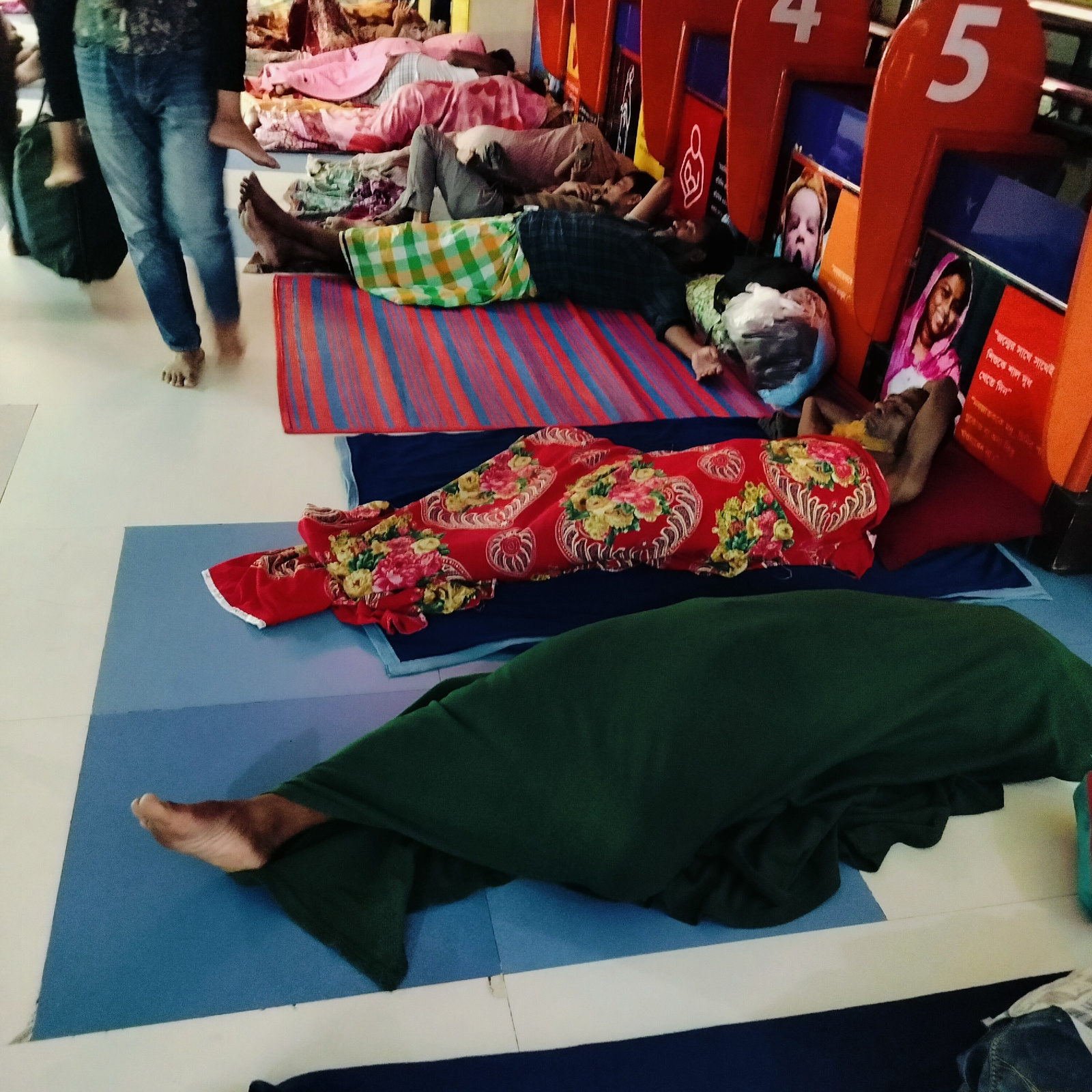The image shows several people sleeping on the floor, likely in a public space in Dhaka, Bangladesh. Six people are visible in various states of rest or wakefulness. They lie on mats and blankets arra…read more