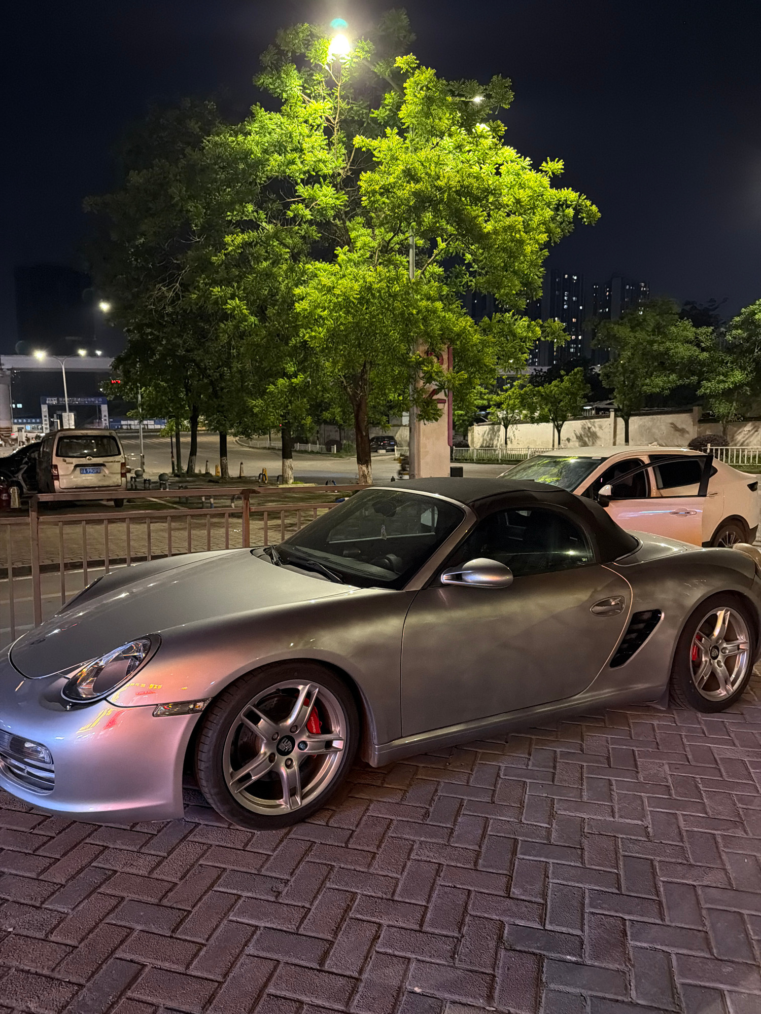 This nighttime image captures a street scene in Chongqing High-tech Zone, China. The primary subject is a silver Porsche Boxster convertible (likely a 987 generation) parked prominently on a dark, bri…read more
