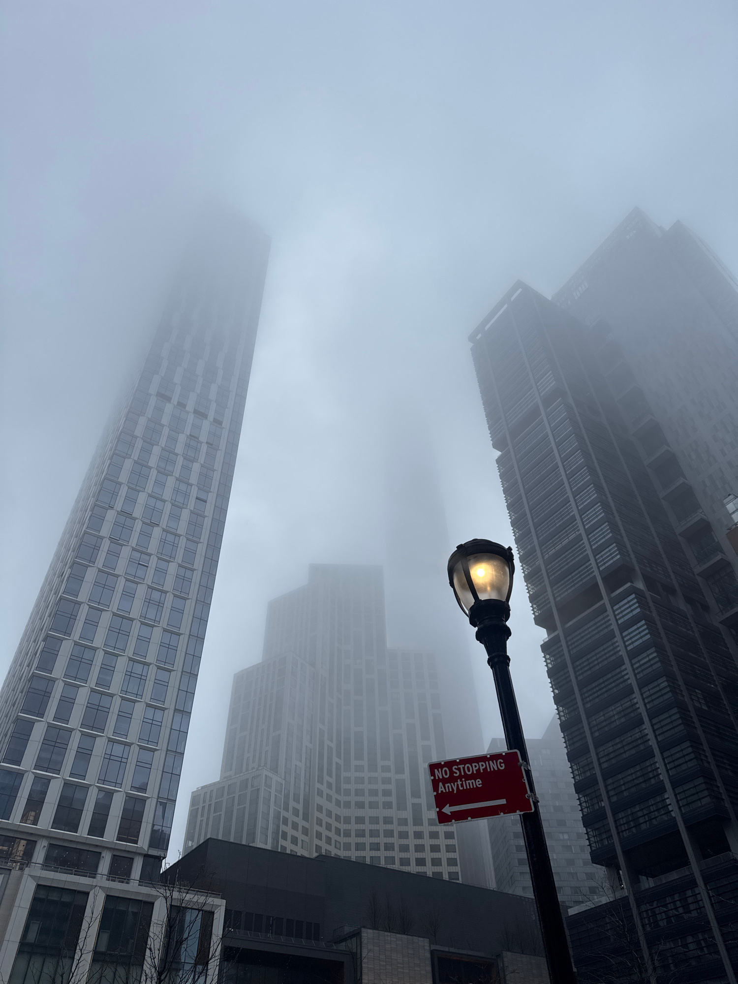 The image depicts a foggy street scene in New York City, United States of America. Tall buildings are partially obscured by the fog, with their upper portions disappearing into the overcast sky. A str…read more
