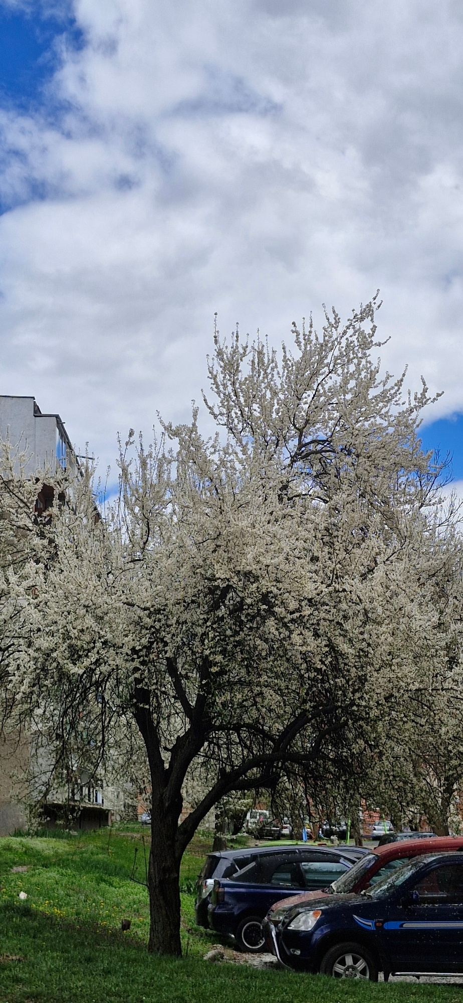 The image shows a flowering tree in Veliko Tarnovo, Bulgaria. The tree is in full bloom with white flowers. A building and several parked cars are visible in the background. The sky is cloudy with pat…read more