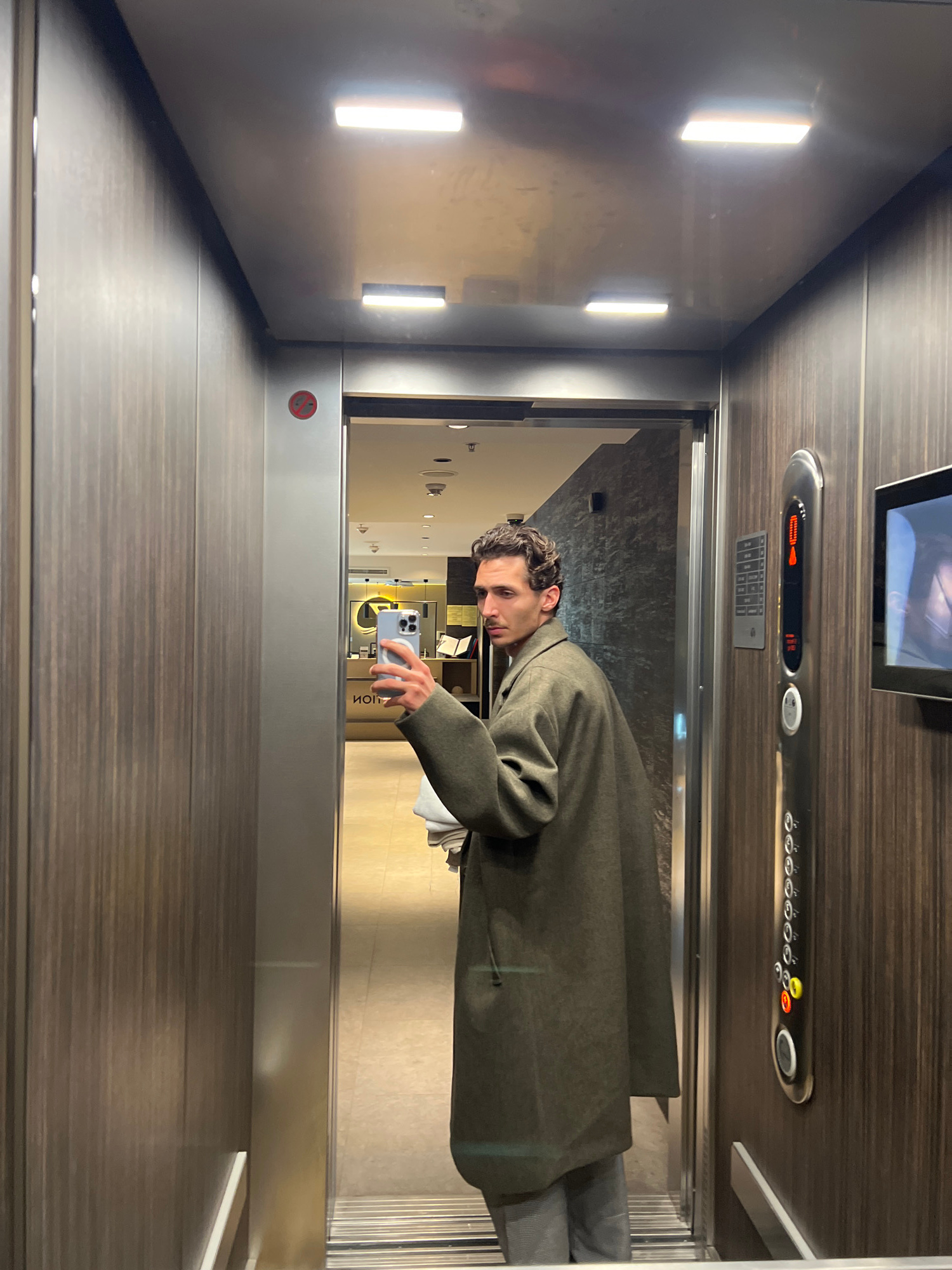 A man in a gray coat is taking a selfie in an elevator. The elevator has wood-paneled walls, bright rectangular lights on the left wall, and a panel with floor numbers and buttons above the elevator dβ¦read more