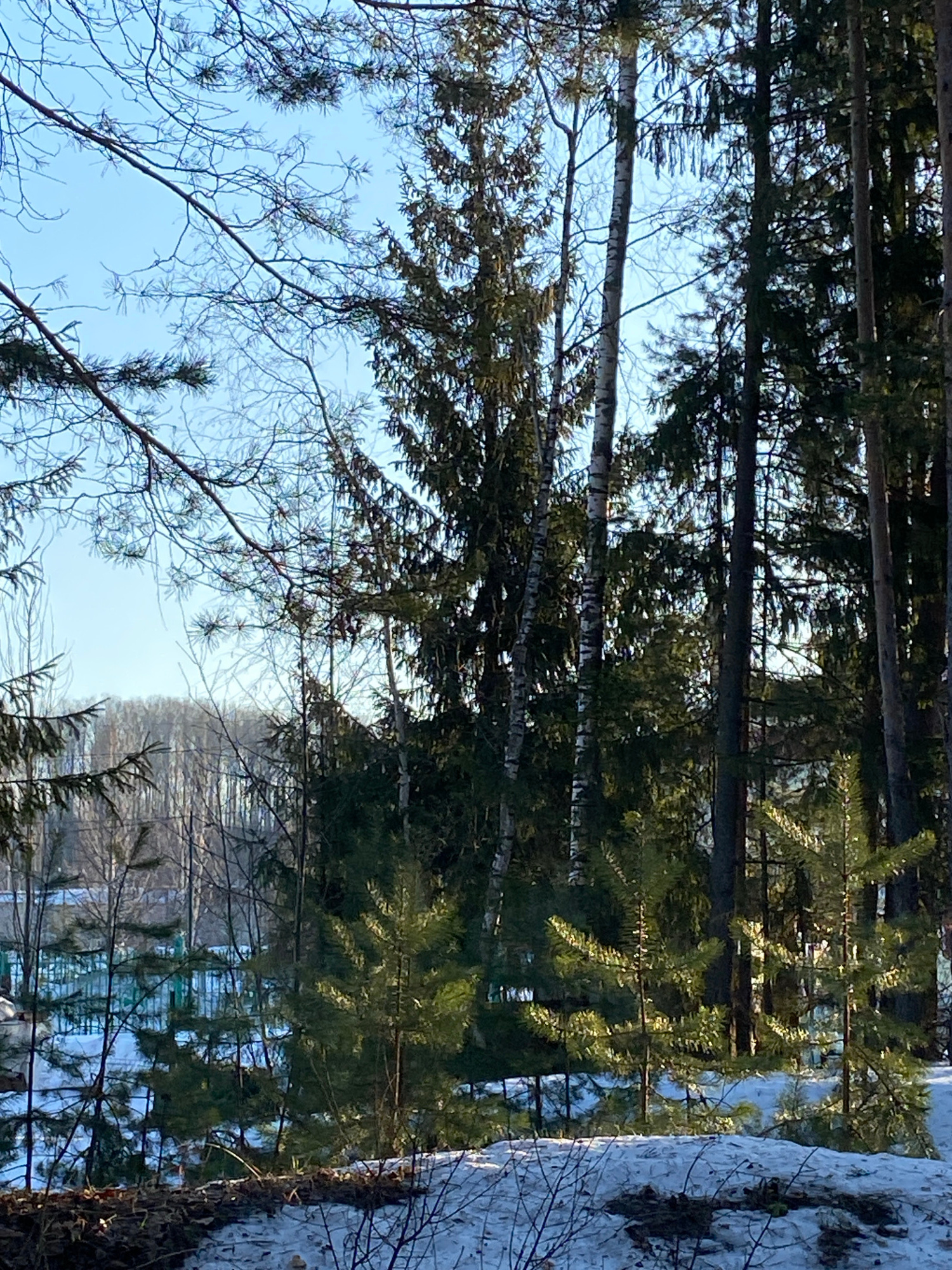 The image depicts a winter forest scene, possibly located in the area of Noviy, Russia. The photo is taken from a low angle, looking upwards through the trees towards a bright, pale blue sky. The fore…read more