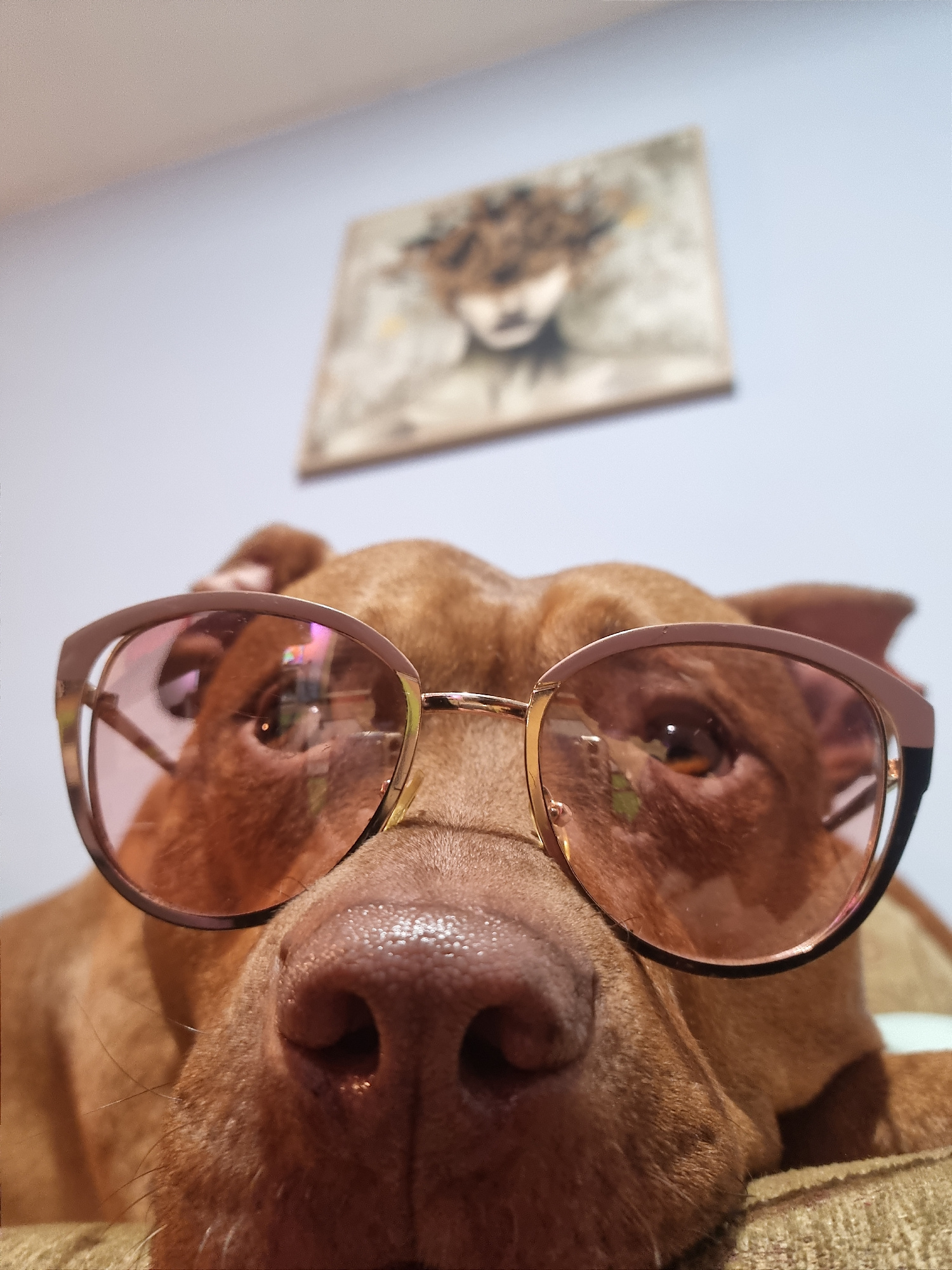 A brown pit bull-type dog is close to the camera, wearing rose-colored sunglasses. The dog's pink nose is prominent. A blurry framed picture hangs on a light-colored wall in the background. The dog ap…read more