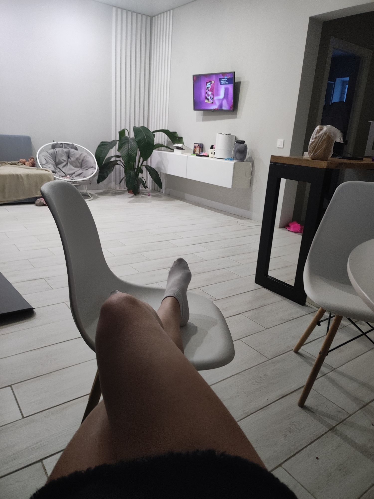 A person is seated in a white chair in an indoor space. The person's legs are crossed, and they are wearing a sock on their left foot. In the background, there is a living room setting with a sofa, a…read more