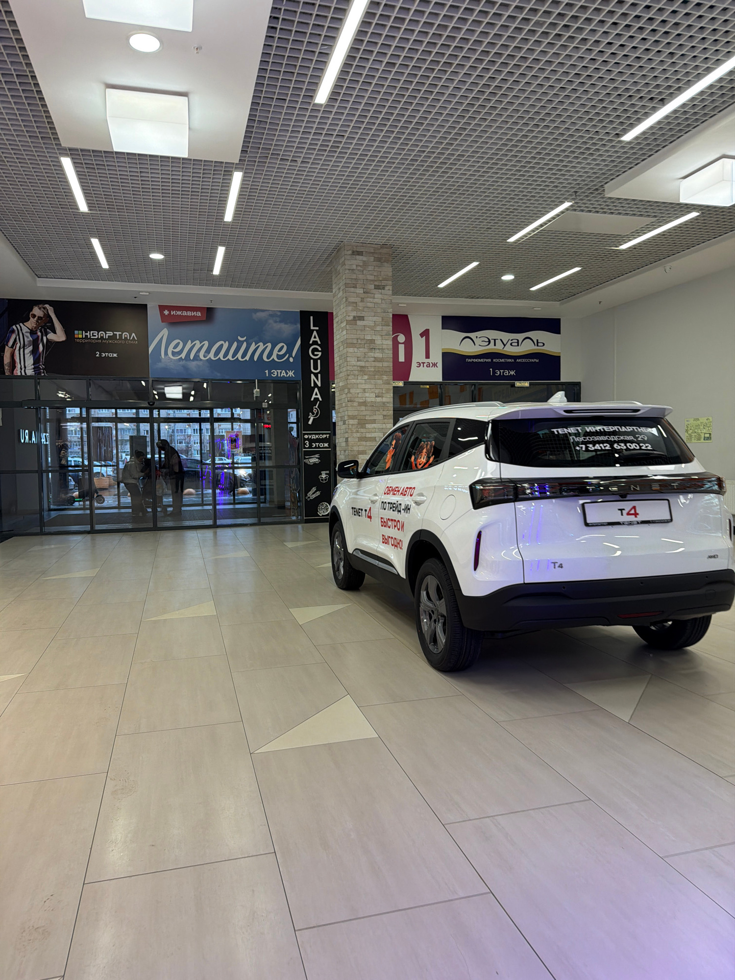 The image depicts the interior of a shopping mall in Izhevsk, Russia. A white car, labeled "T4" and bearing the "TENET ИНТЕРПАРТНЕ" (TENET INTERPARTNER) advertisement with the address "Лесозаводская,…read more