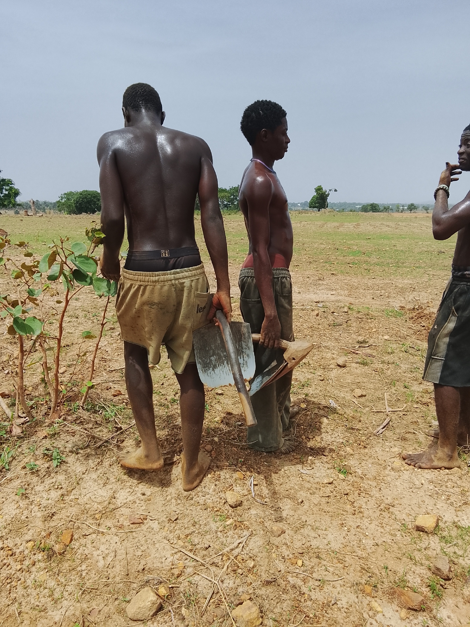 Three shirtless Black men stand in a dry, open field, likely near Akwanga, Nigeria, based on the prompt. The man on the left is seen from the back, holding a shovel and standing near a small tree. Ano…read more
