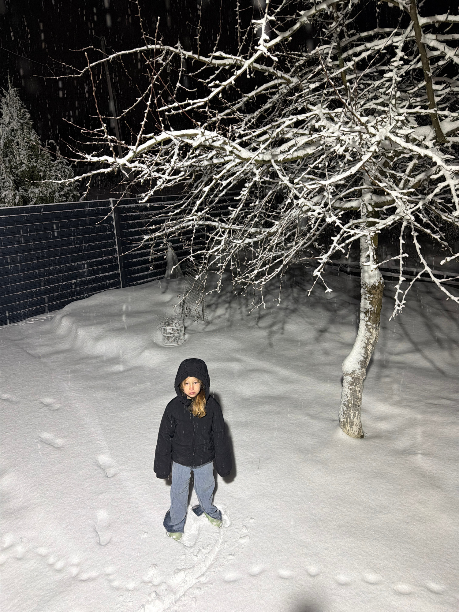 A girl is lying in the snow in what appears to be a backyard or garden at night. The area is covered in a thick layer of snow. The girl is wearing a dark jacket, jeans, and shoes, and the hood of her…read more