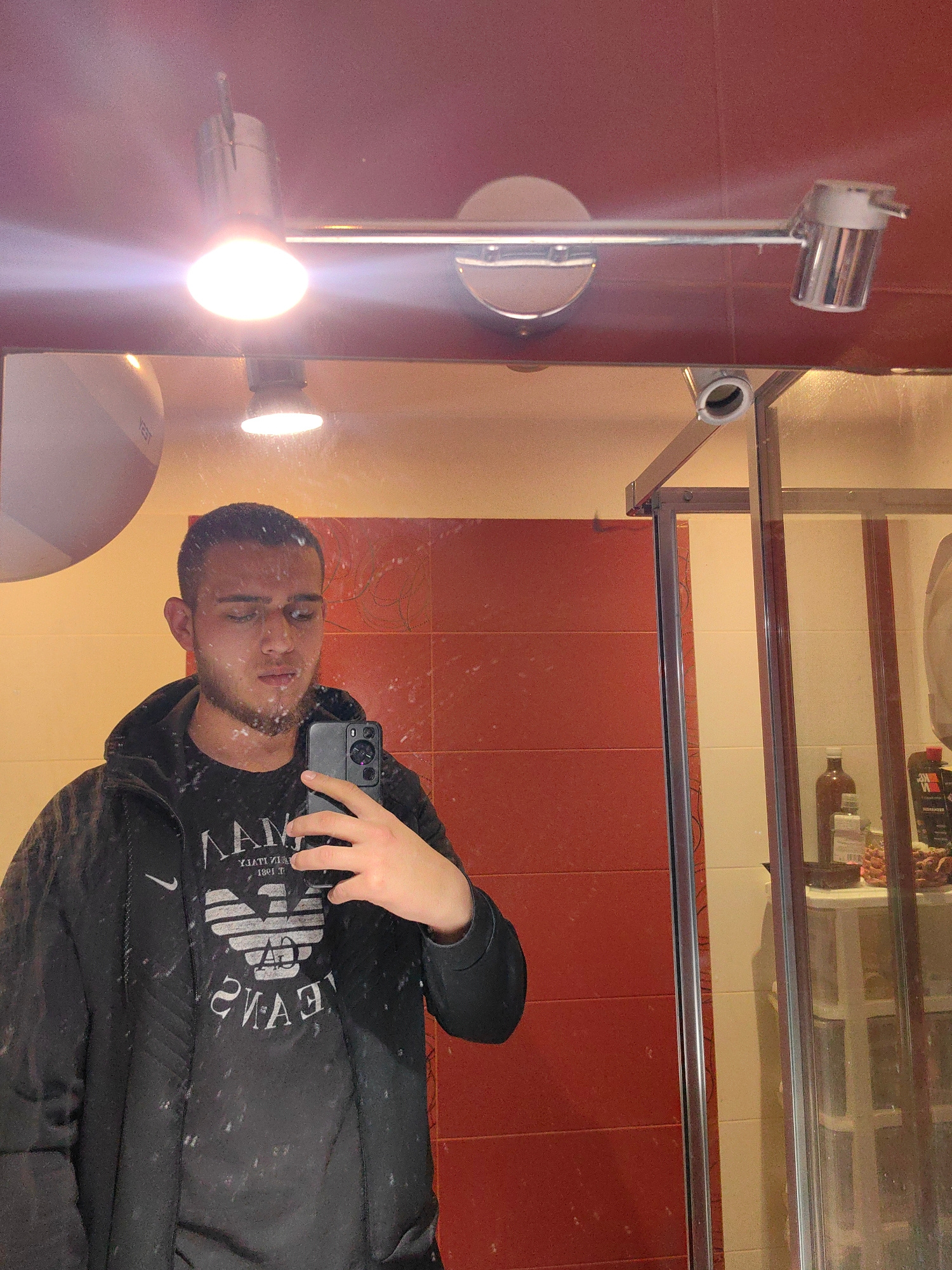 A man is taking a selfie in a bathroom mirror. He is wearing a black jacket with an Armani Jeans shirt underneath. The bathroom has a red tiled wall, a shower cubicle with toiletries on a shelf, and a…read more