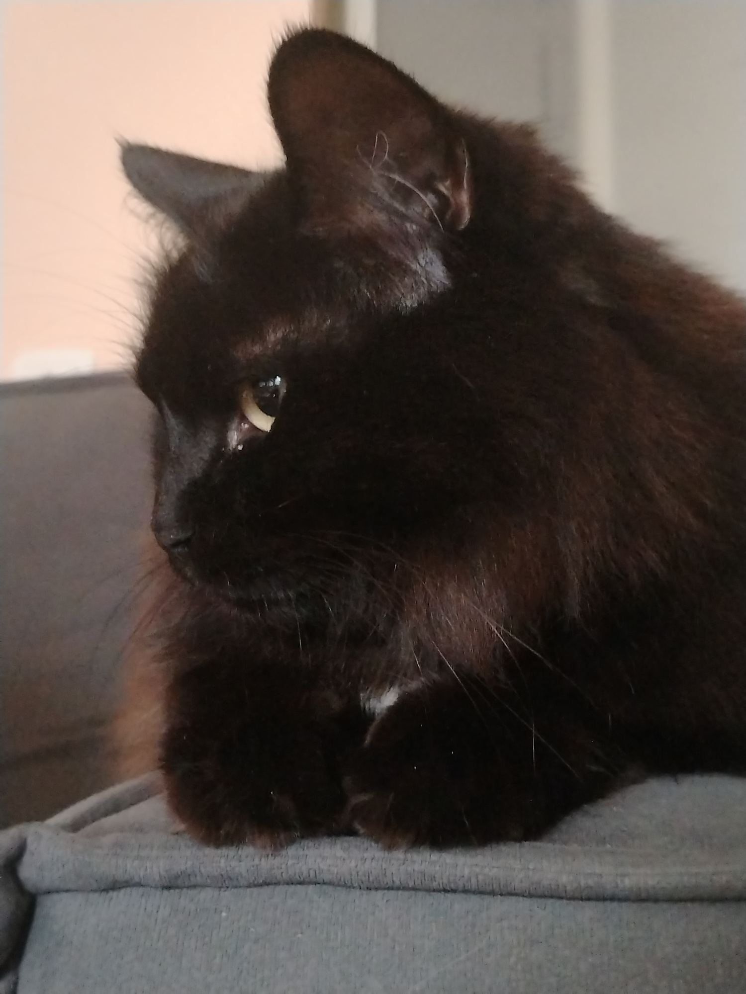 A close-up shot depicts a black cat with a focused, side-profile gaze. The cat's fur is long and dense, with subtle reddish-brown highlights visible in the sunlight. Its eyes are yellow and almond-sha…read more