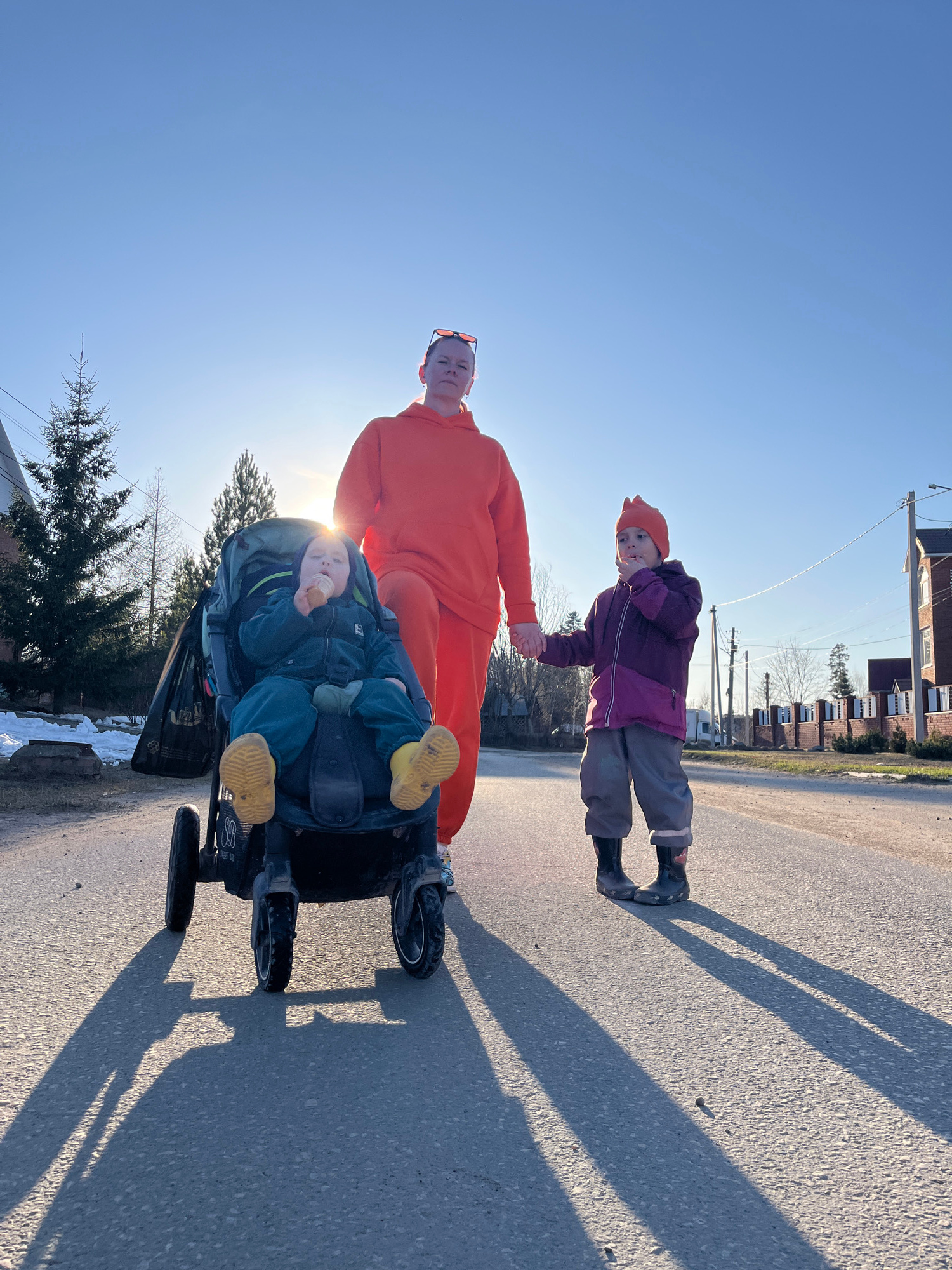Three individuals, an adult and two children, are captured on a paved road in what appears to be Chaikovsky, Russia. The image is taken outdoors on a bright, sunny day, with a clear blue sky. The sun…read more