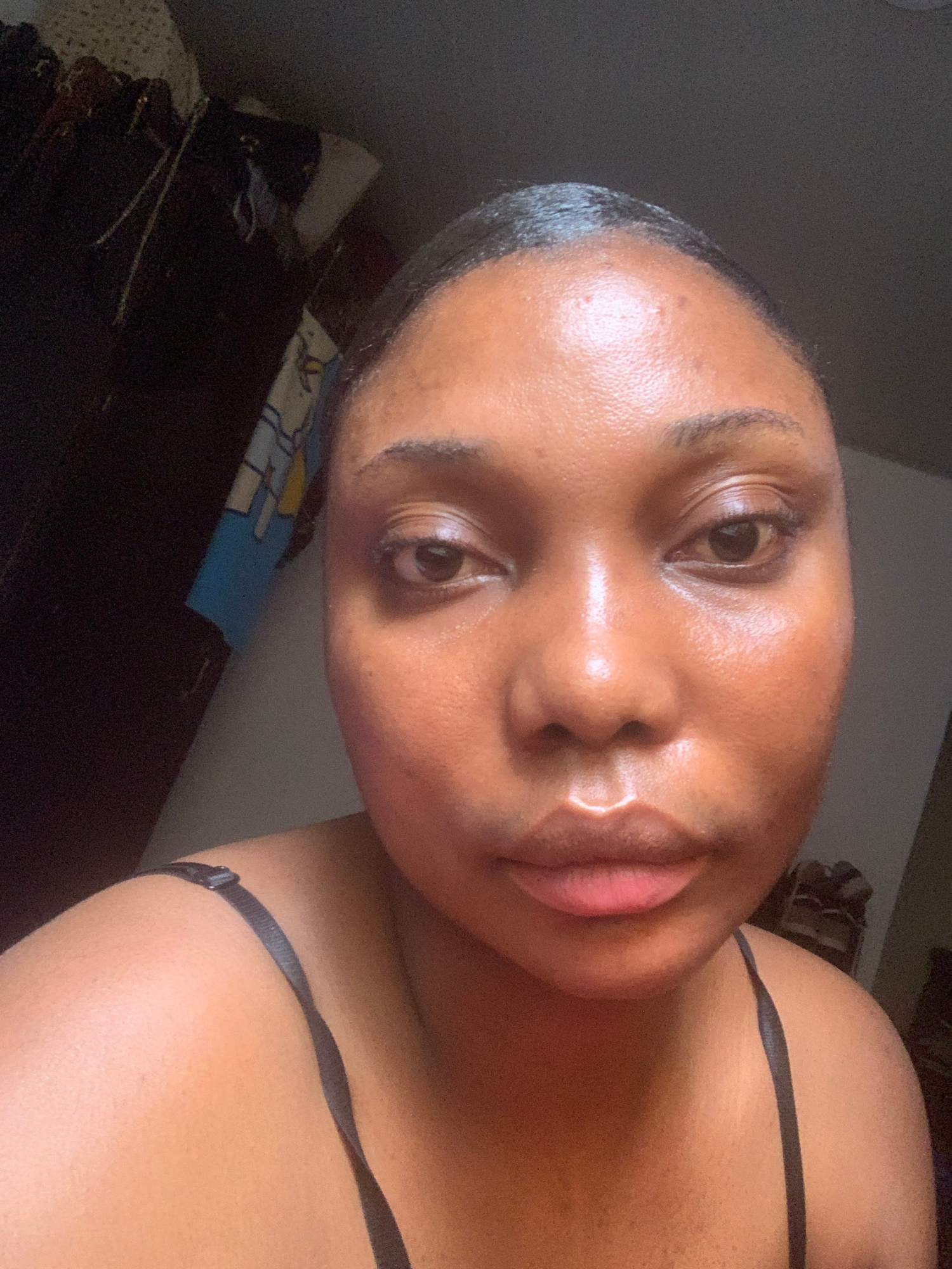 A close-up selfie shows a young woman with brown skin. She has smooth skin, short dark hair, and full lips. A thin black strap crosses her right shoulder. The background is dark and cluttered, with a…read more