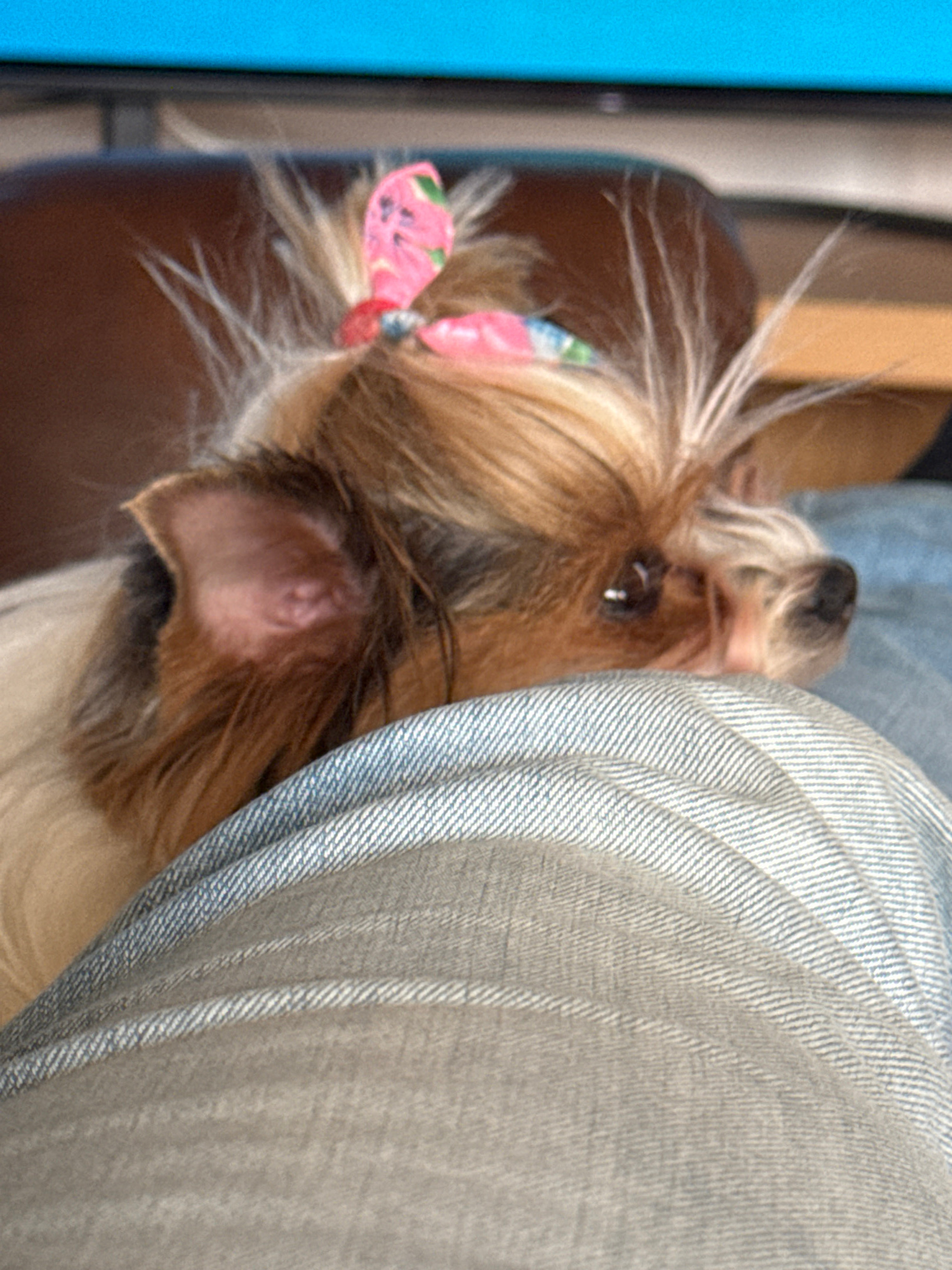 A close-up photograph shows a small, long-haired dog, likely a Yorkshire Terrier or similar breed, peering from behind a piece of denim clothing. The dog has a pink, patterned bow in its hair. The dog…read more