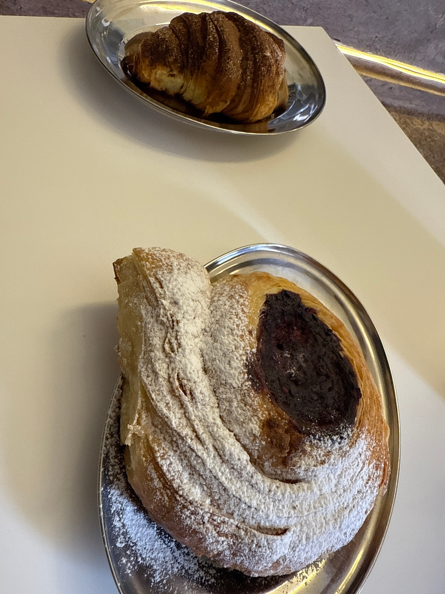 The image displays two pastries served on metallic plates, positioned on a clean, light-colored table or counter. On the left, an oval, shiny silver plate holds a golden-brown croissant, its layered t…read more