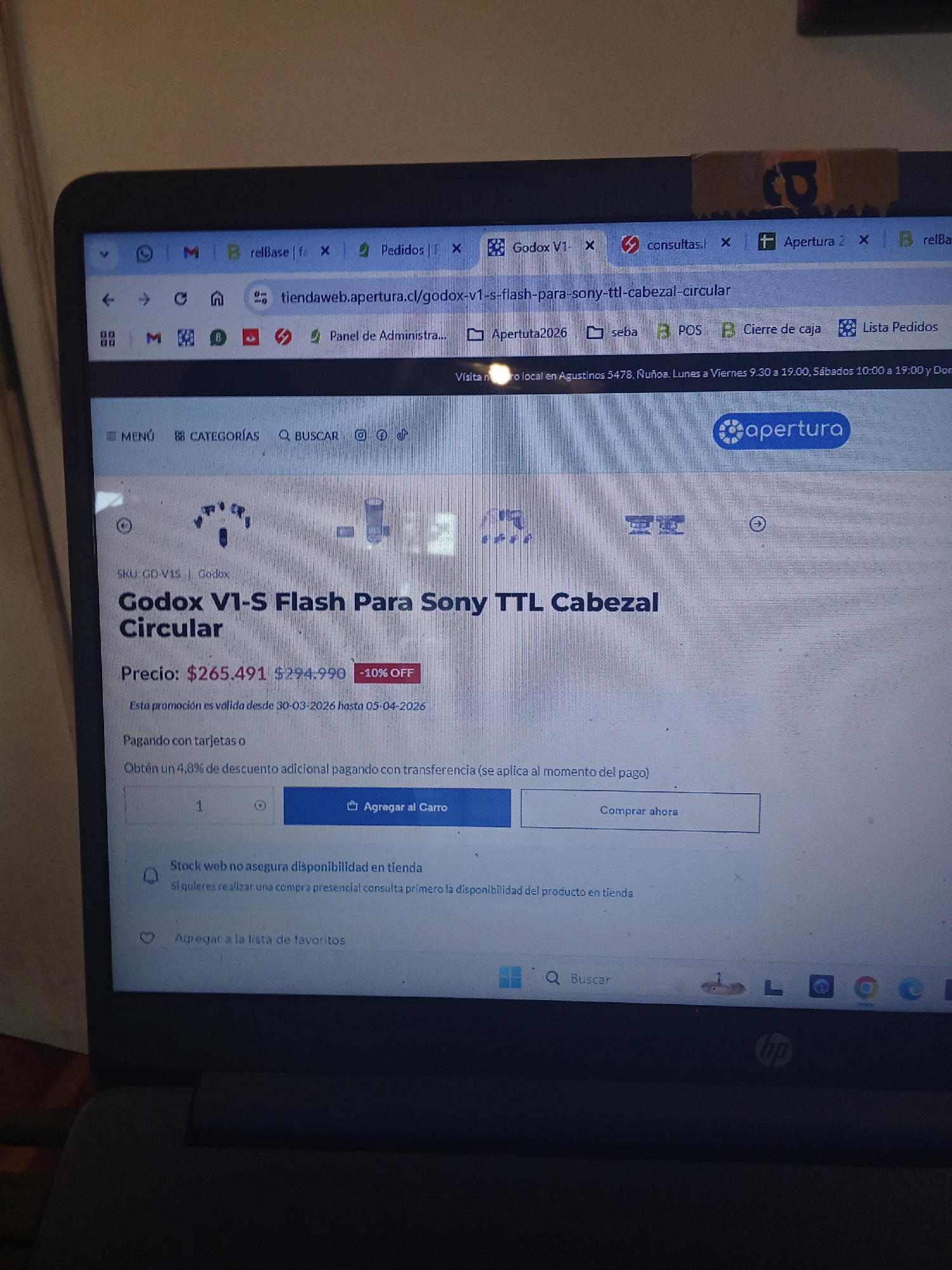 The image shows a laptop screen displaying an online store page. The product listed is a "Godox V1-S Flash Para Sony TTL Cabezal Circular", priced at $265,491 Chilean pesos, with a discount from $294,…read more