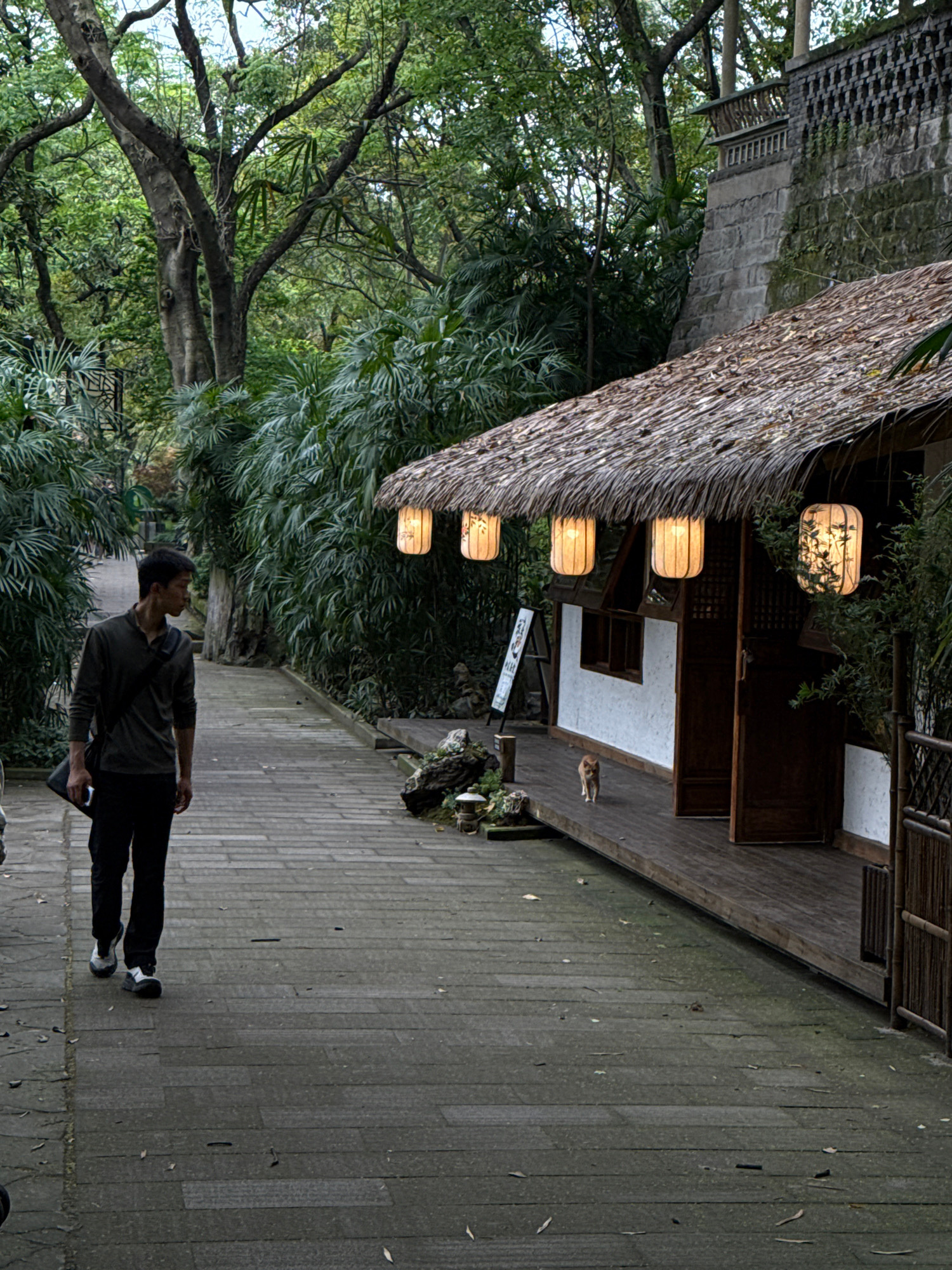 A man walks along a stone pathway in Yuzhong District, China. He is wearing dark pants and a grey shirt and holding a dark object, possibly a phone. To his right is a traditional building with a thatcβ¦read more