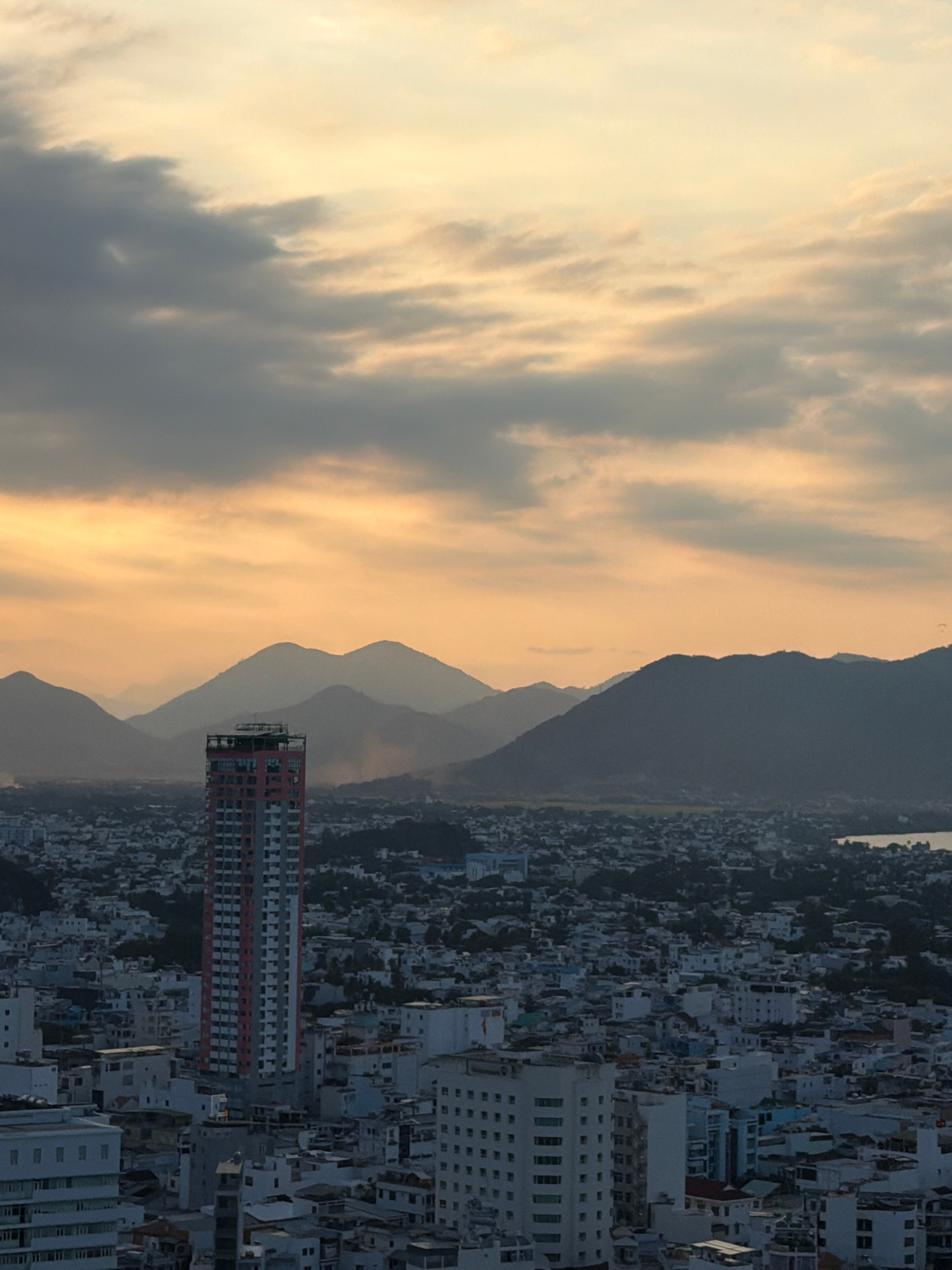 This media file presents a panoramic view of a densely populated coastal city, identified as Nha Trang, Vietnam, captured during either sunrise or sunset. The upper portion of the image is dominated b…read more