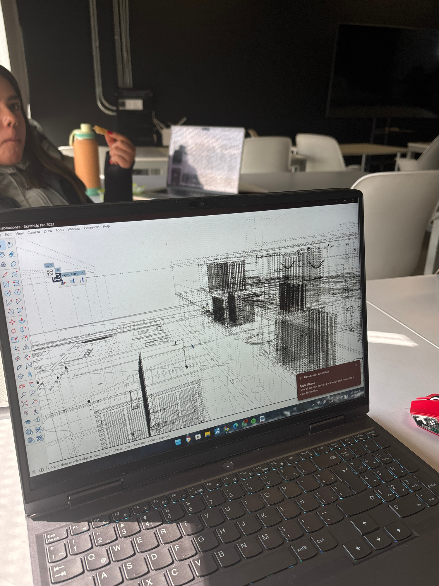 Here is a matter-of-fact description of the image: The image shows a close-up of a black laptop with a design software interface (SketchUp Pro 2023) on the screen displaying a building plan. The lapt…read more