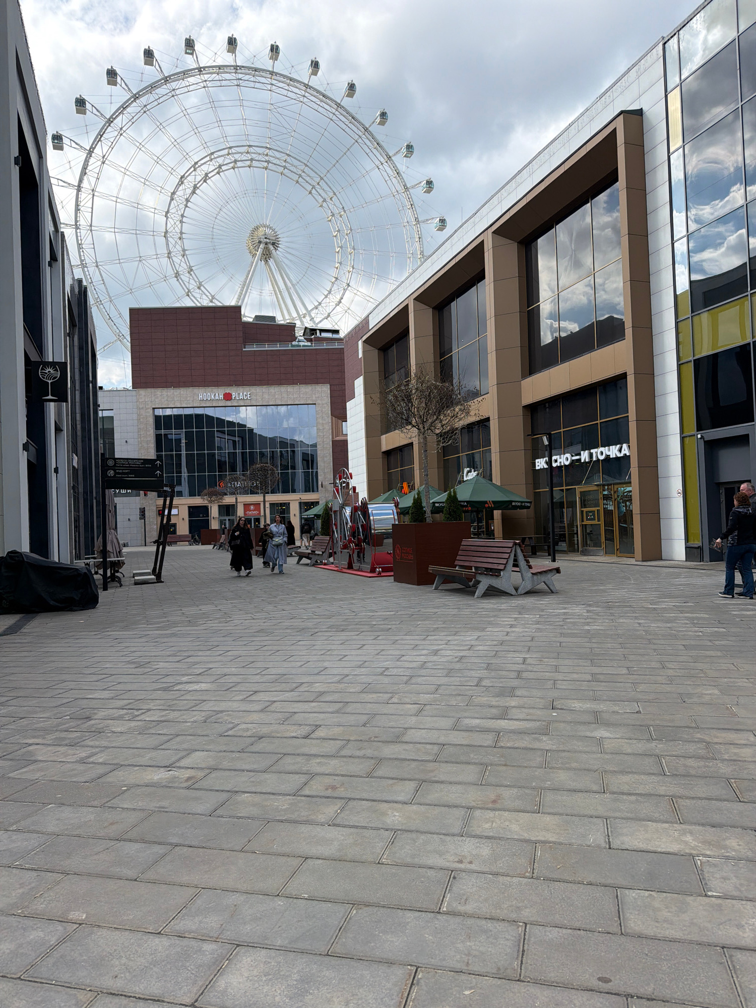 This image captures an urban scene in Moscow, Russia, featuring a large Ferris wheel and modern buildings under an overcast sky. In the left half of the frame, a grand, white Ferris wheel dominates t…read more